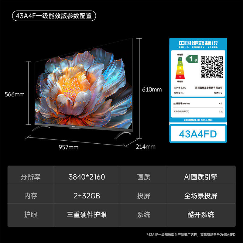 创维43A4FD 43英寸4K超高清电视机远场语音 2+32GB大内存平板液晶