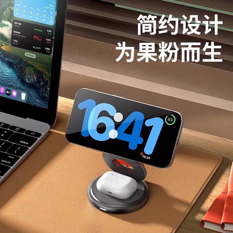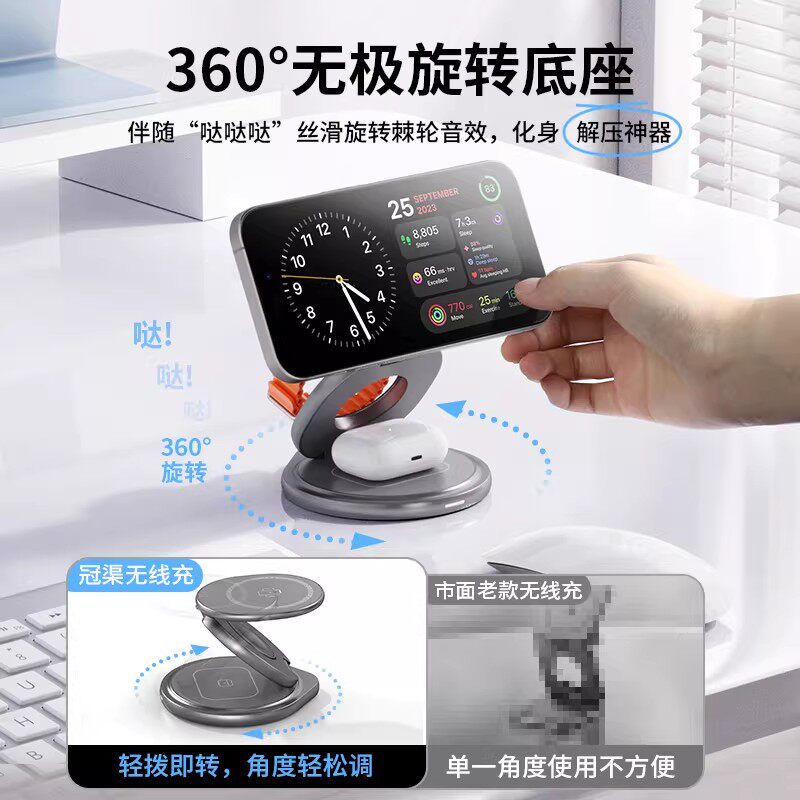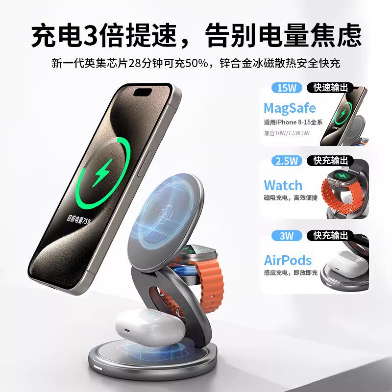 冠渠qi2三合一无线充电器适用苹果17Magsafe磁吸iPhone16折叠手机支架耳机apple watch手表充电座AirPods旋转