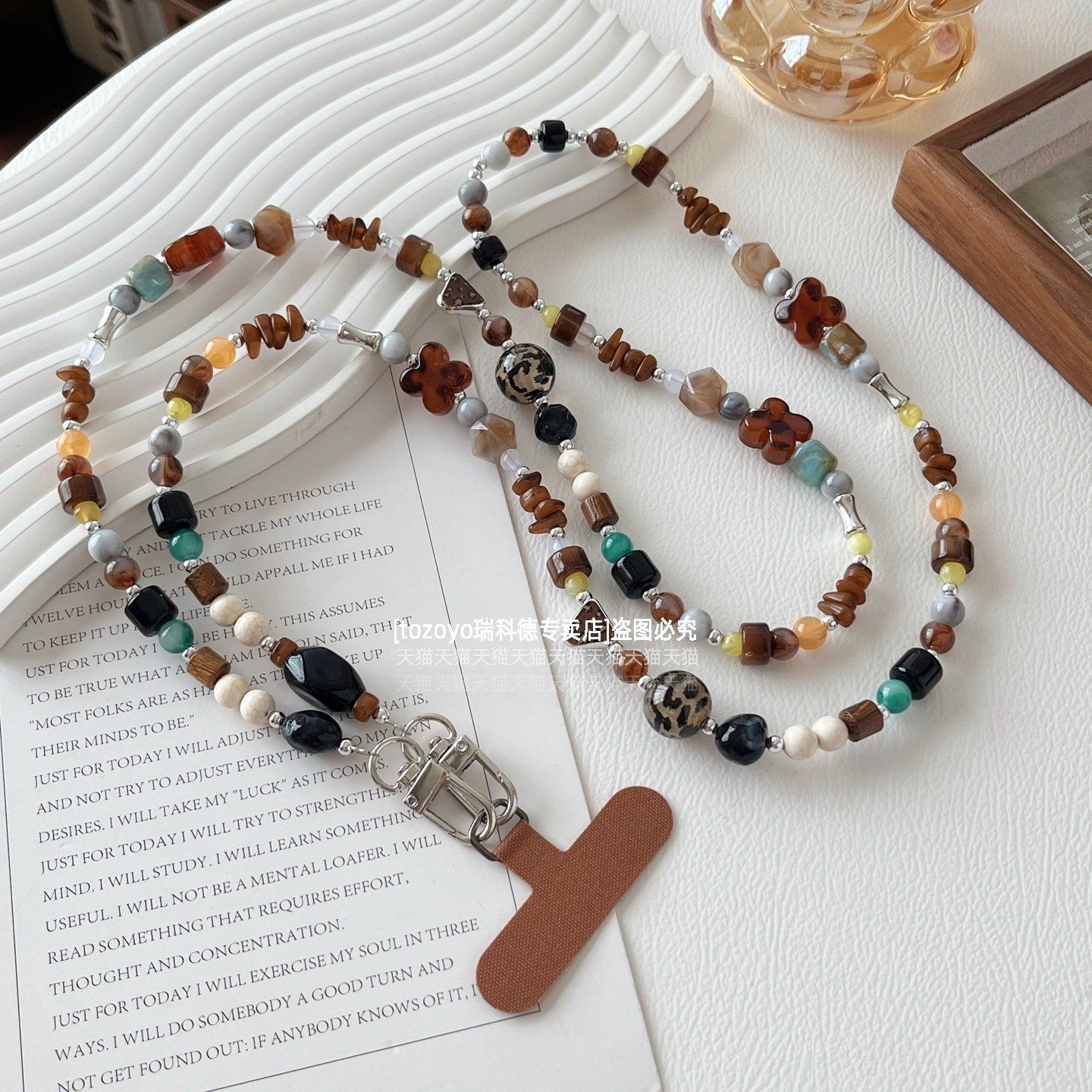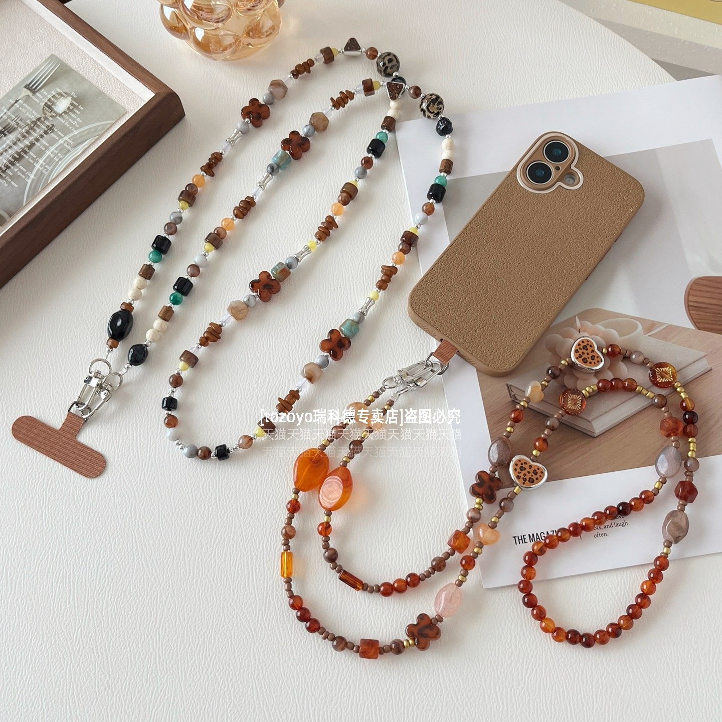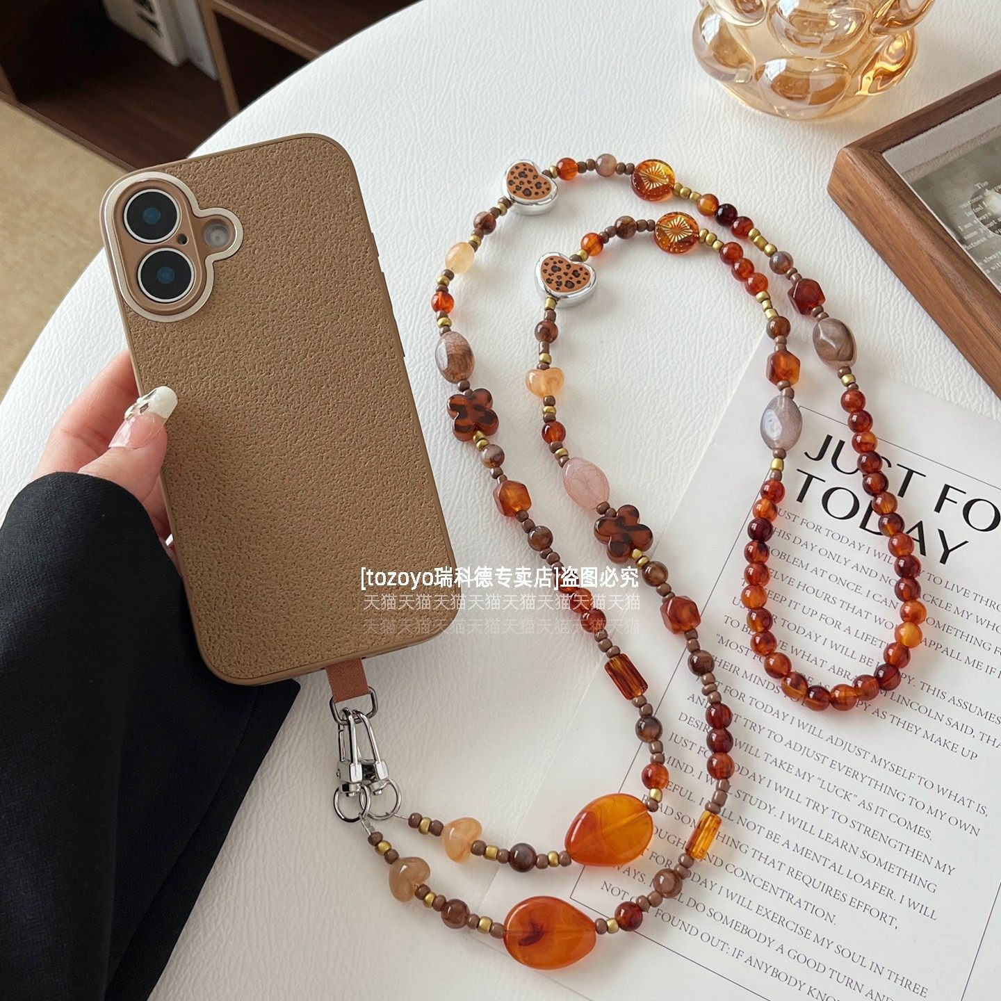 巨好看复古手机链精致高级感不规则串珠豹纹链条斜挎可背时尚挂链小众长款包包挂饰带垫片防丢包包漂亮棕色壳