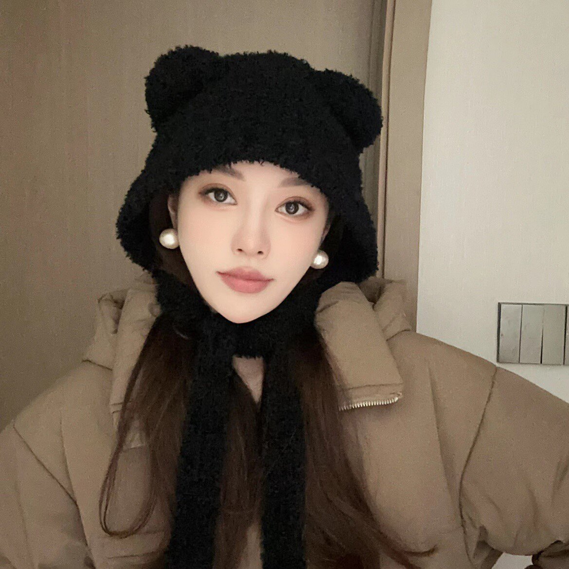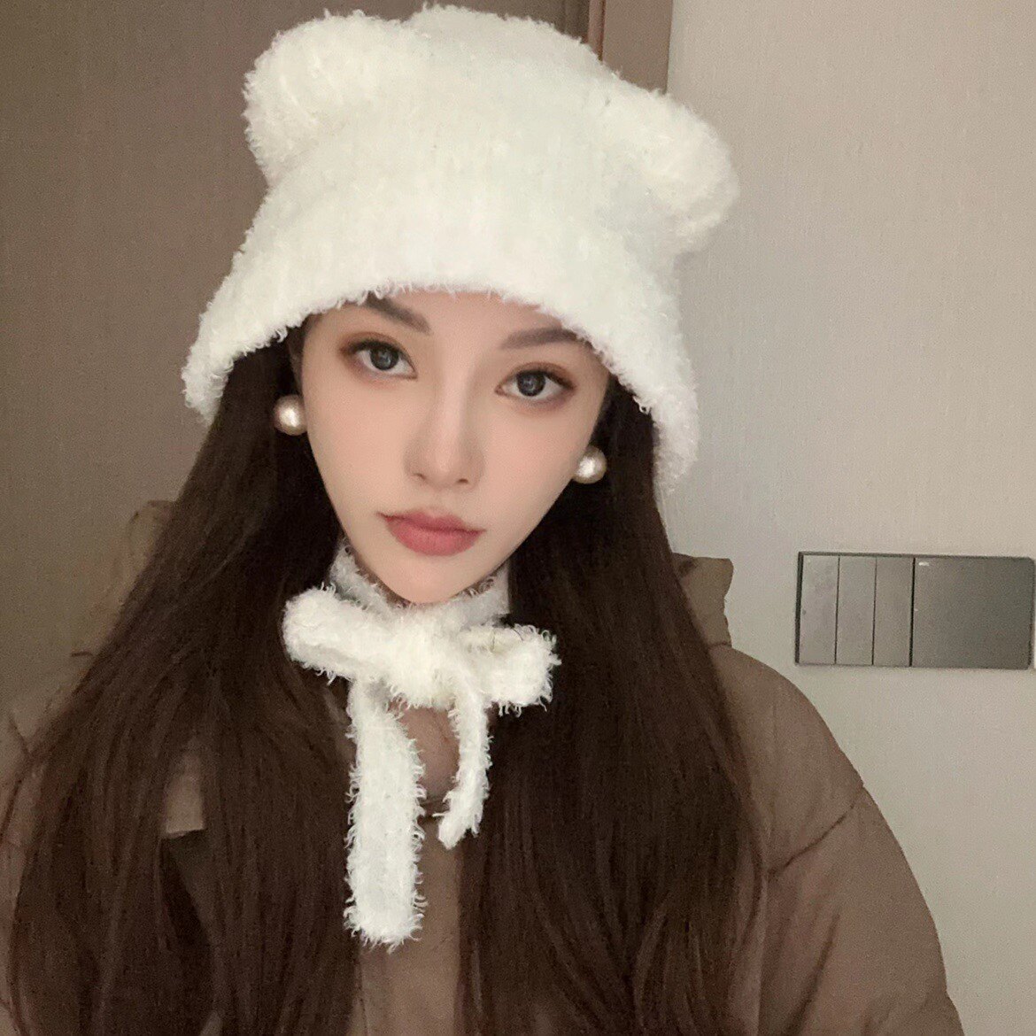 2025新款小熊毛线针织冬天帽子女款毛绒大头围冬季骑车护耳套头帽