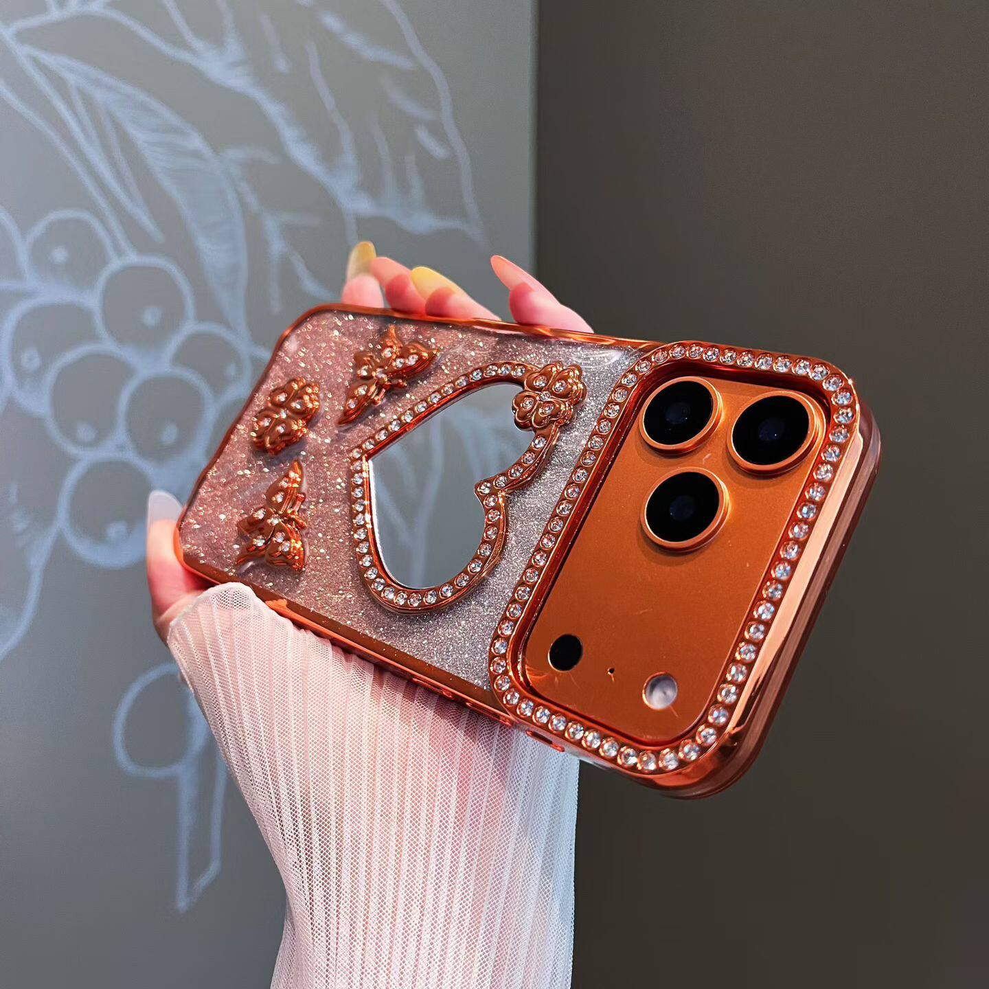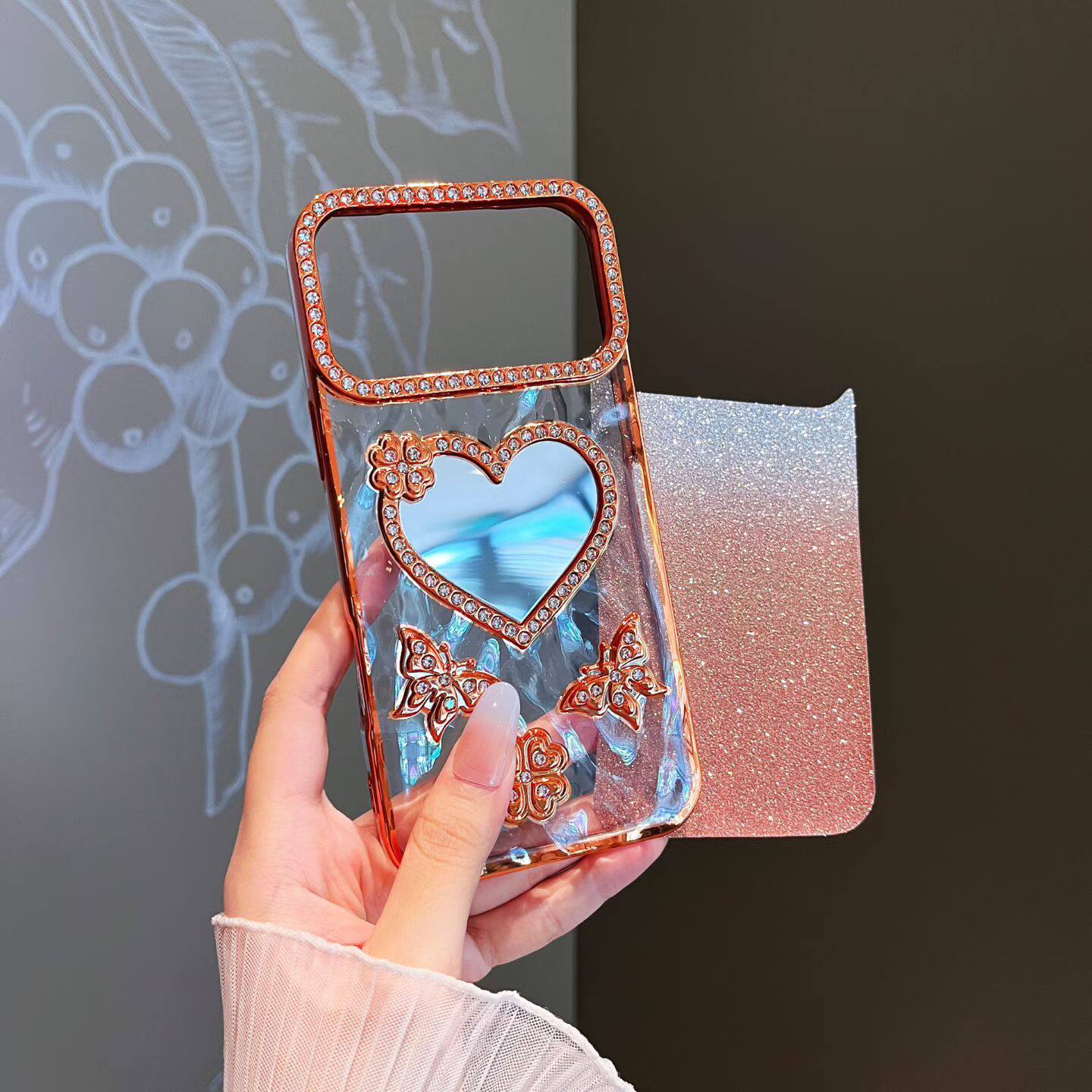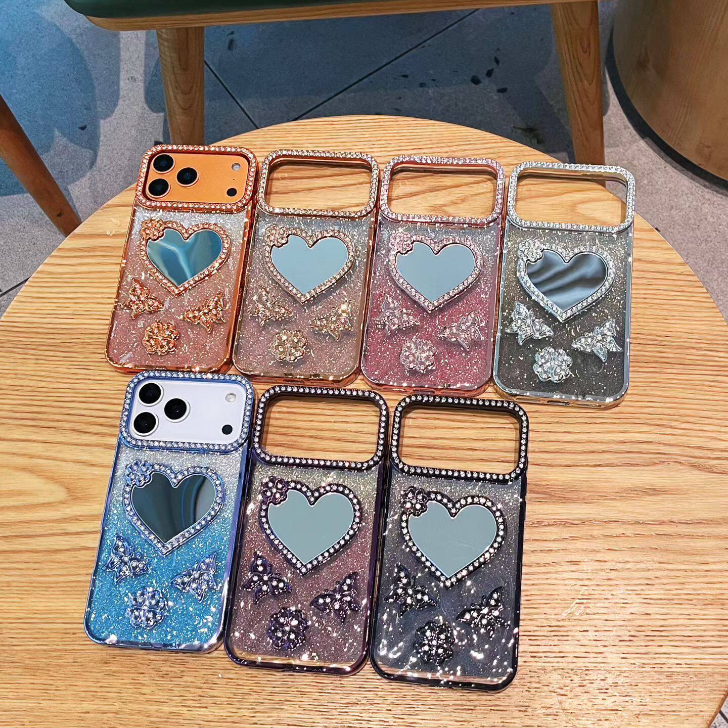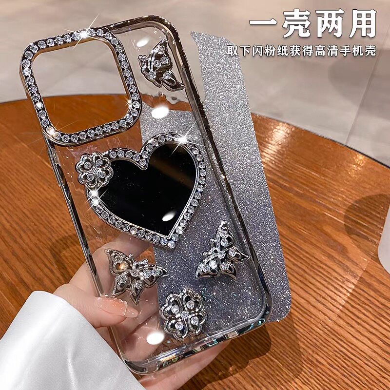新款闪粉水钻蝴蝶爱心补妆镜子适用苹果16promax手机壳iphone17pro高级感女14化妆镜13全包防摔15p网红硅胶套