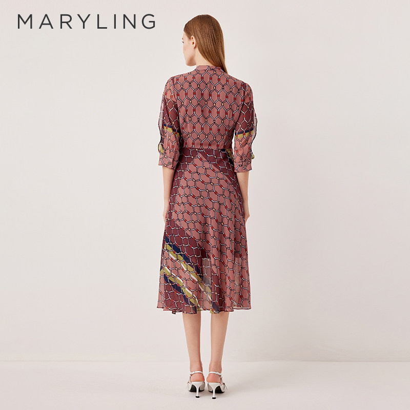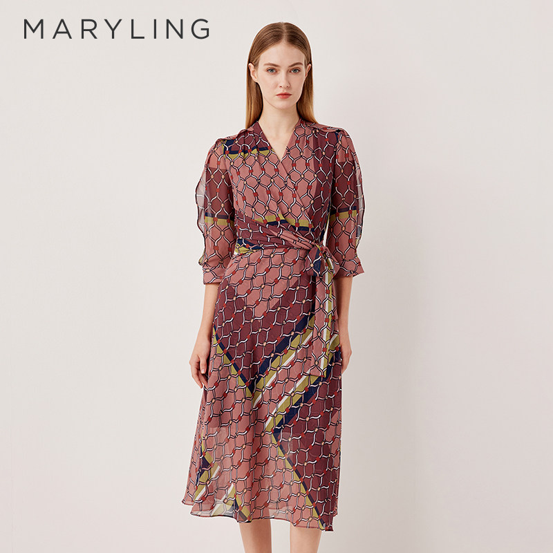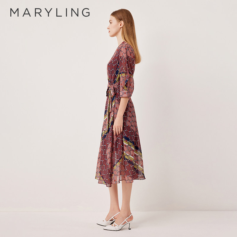 MARYLING玛俪琳2025秋季新品豆沙色V领系带印花连衣裙A1FFW61110