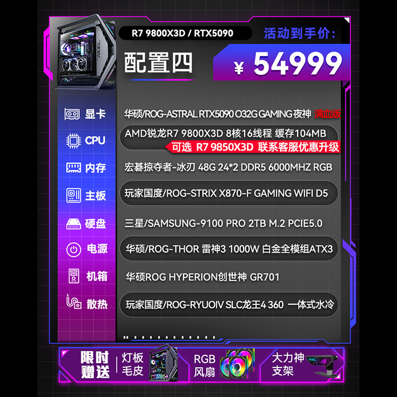 华硕ROG全家桶满血R7 9800X3D RTX5090 游戏AI渲染DIY组装电脑