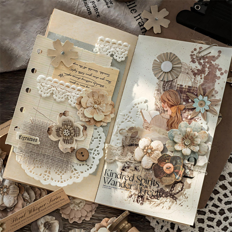 M|剪语花硬卡裁边贴纸 布料纹理花朵纽扣手作痛包封口贴50张入