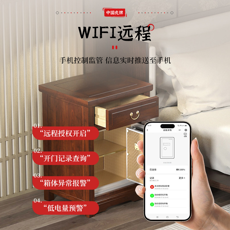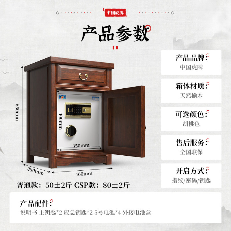 虎牌中式保险柜家用实木床头柜65CM老榆木抽屉储物保险箱智能WiFi远程开启大容量古典新中式智能床头2025新款