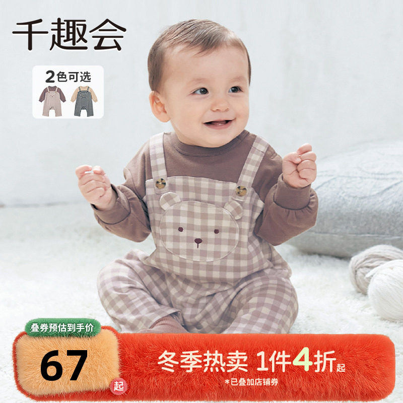 千趣会童装婴幼儿小熊叠穿风背带裤长袖棉质连体衣
