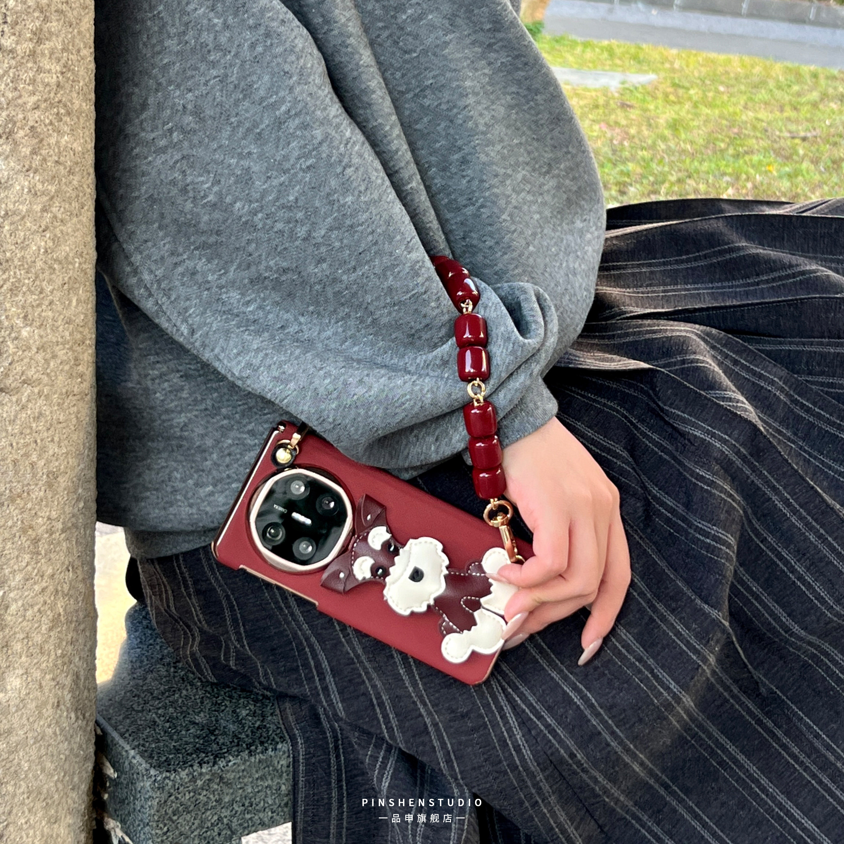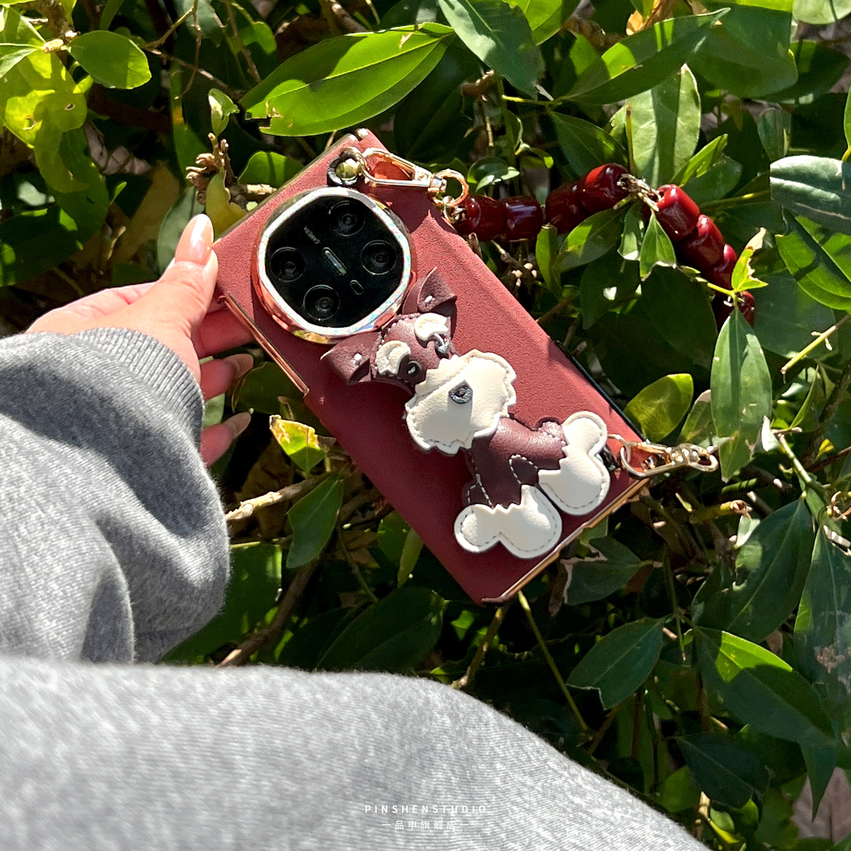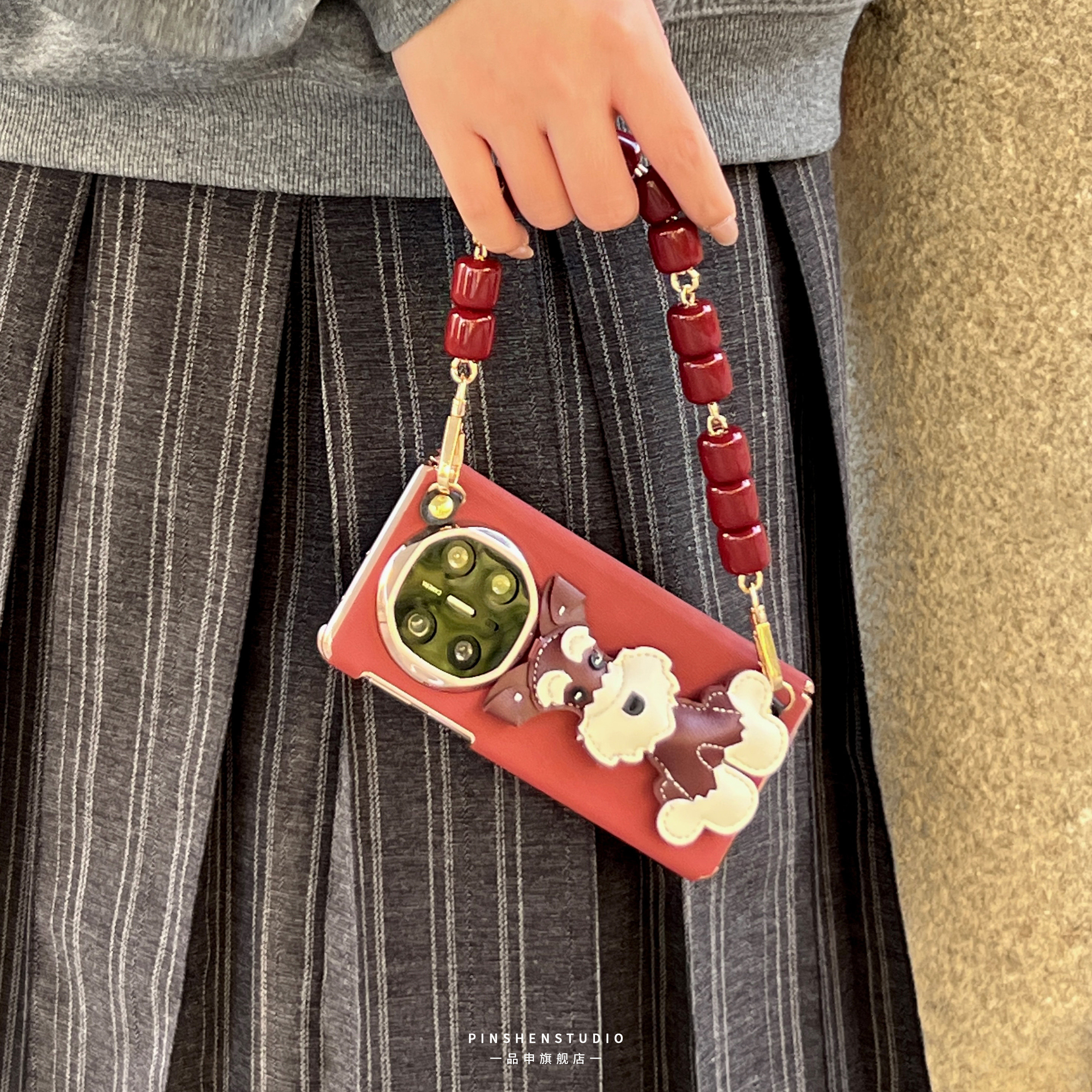 高级感酒红色雪纳瑞小狗配饰手提链条手机壳