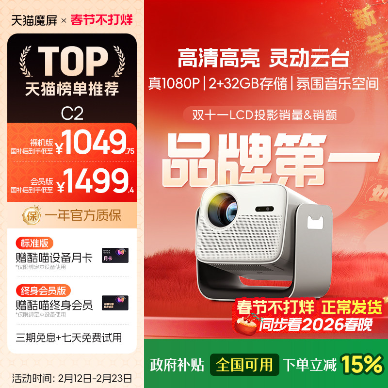 【李佳琦超级年货家装潮电节】天猫魔屏C2智能投影仪家用云台家庭影院超高清可连手机投屏可投天花板便携卧室