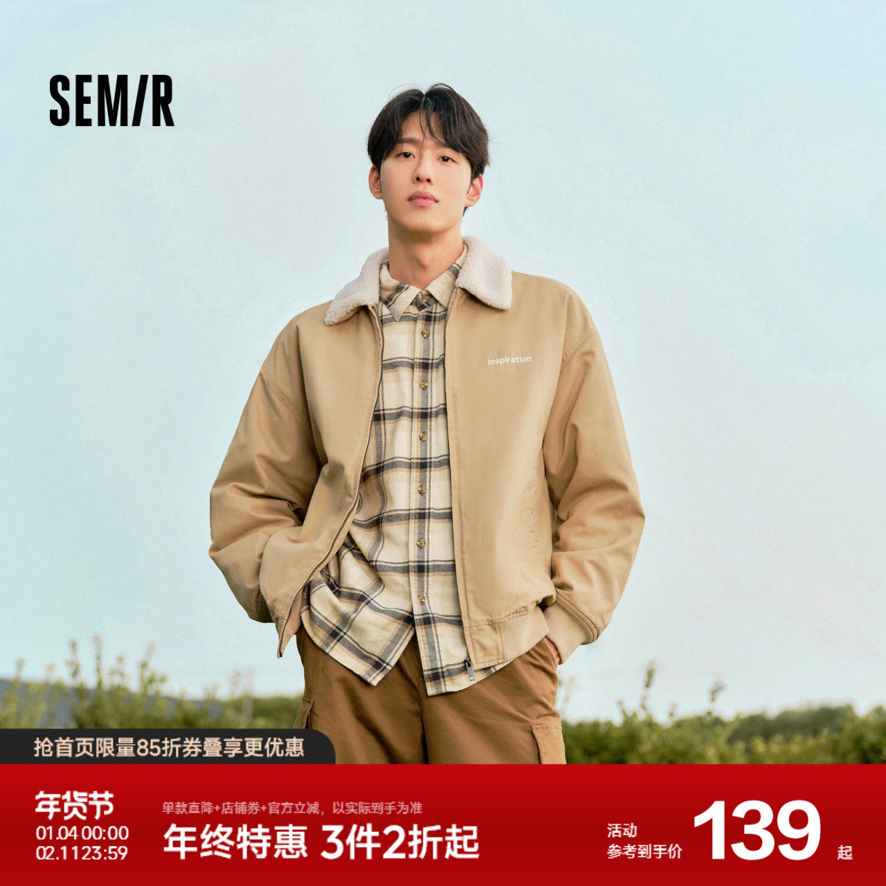 森马夹克男2024冬季新款复古拼接仿羊羔毛翻领外套宽松绣花棉服潮