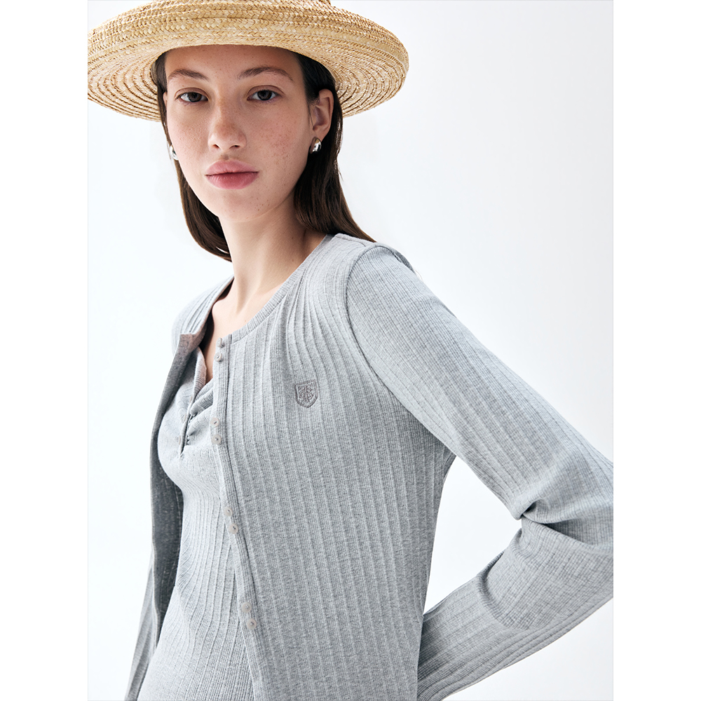 蕉下亨利衫女长袖T恤v领秋冬修身保暖低领打底衫半开领白色上衣