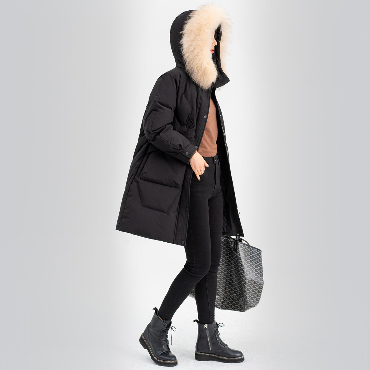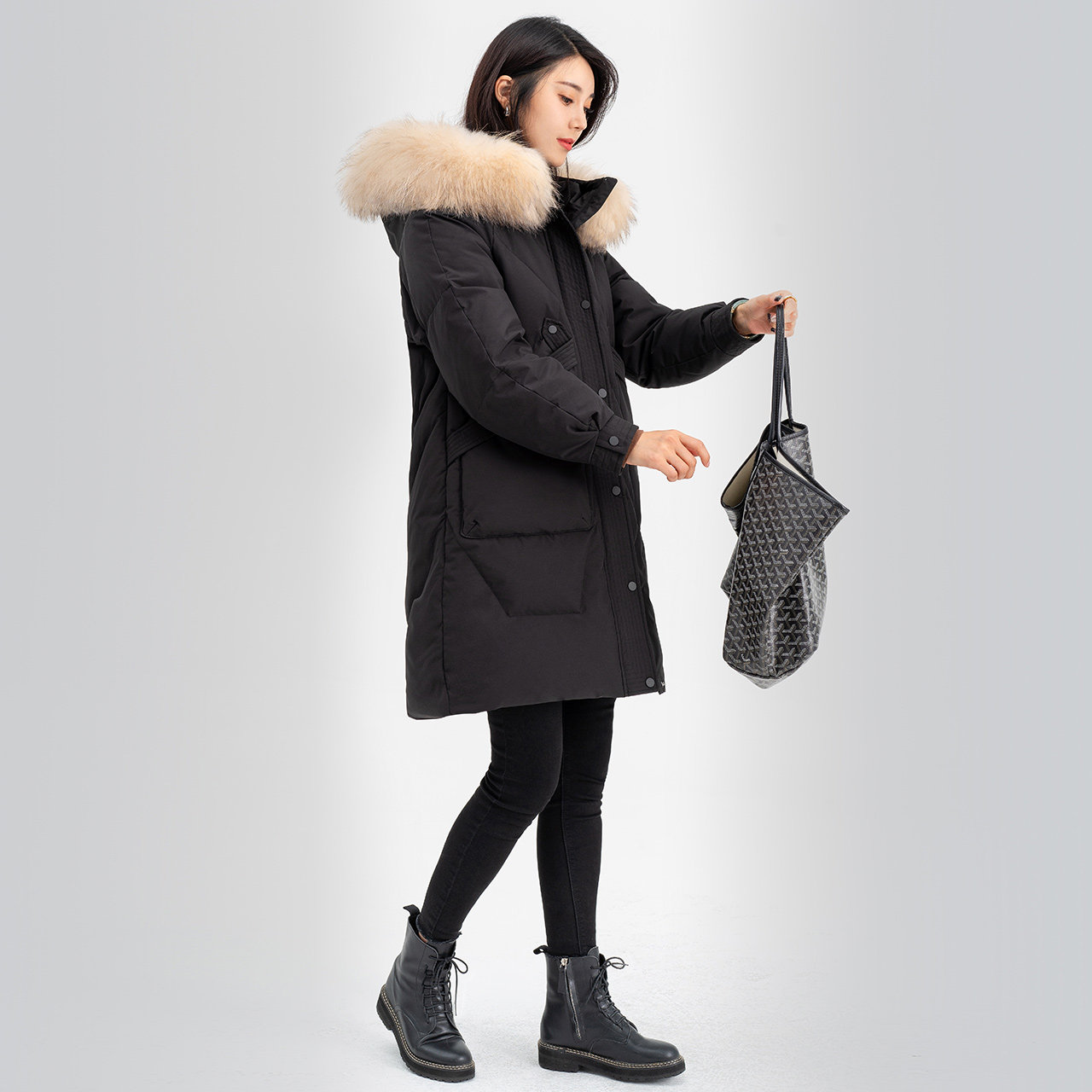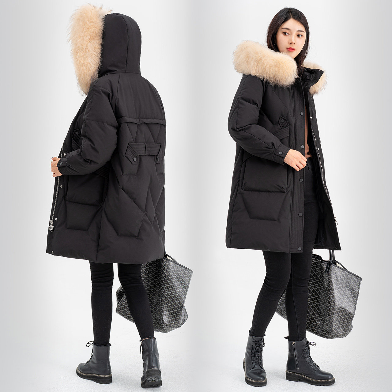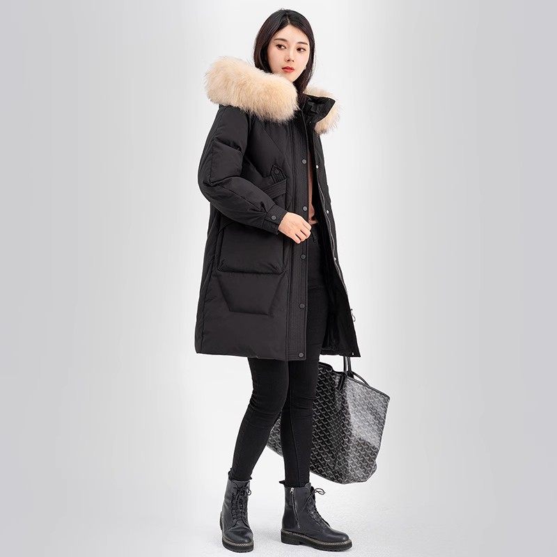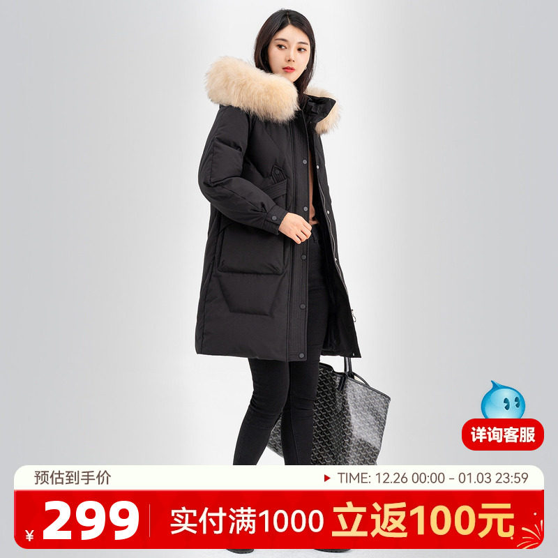 雪中飞秋冬大毛领连帽宽松中长款时尚女士保暖羽绒服