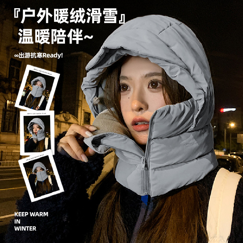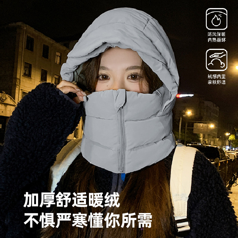围巾帽子手套一体女连帽冬季帽可爱保暖围脖毛绒冬天三件套厚防寒