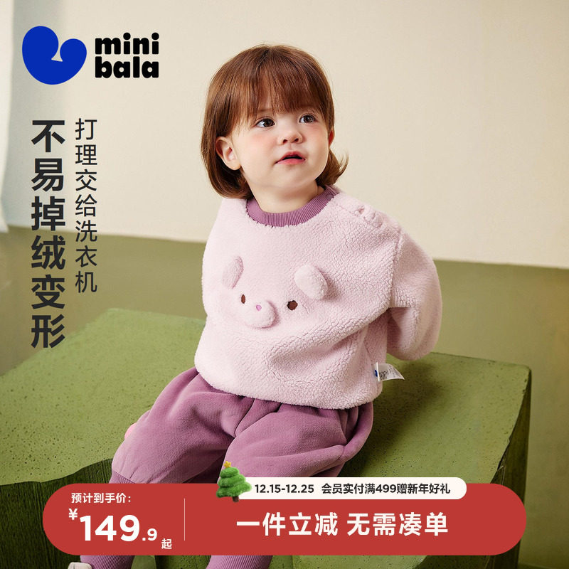迷你巴拉巴拉男女童宝宝毛绒套装宽松保暖长袖长裤两件套冬新款