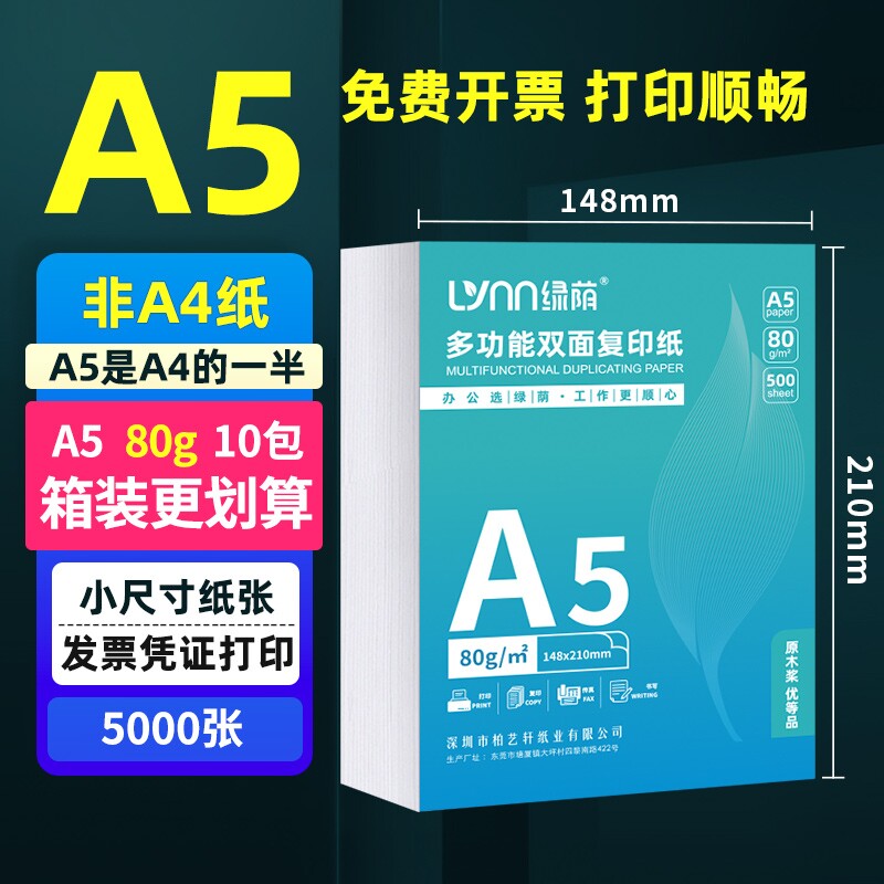 绿荫A5复印纸整箱装5000张a5纸打印纸复印纸70克加厚80g财务会计凭证纸白纸试卷纸草稿纸学生办公用纸