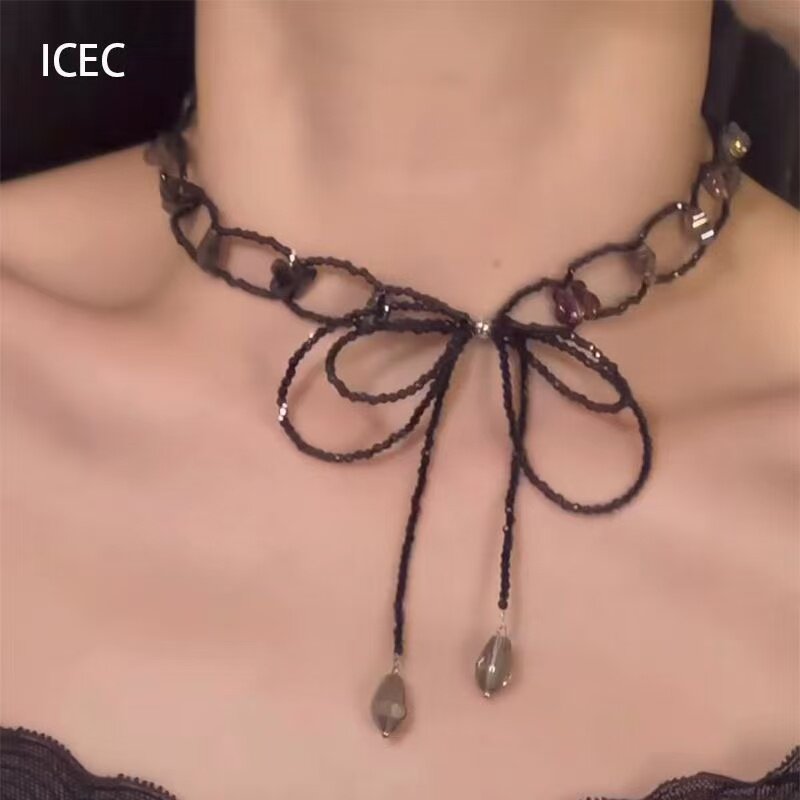 黑色蝴蝶结串珠项链甜酷辣妹风时尚颈链在逃公主精致感叠戴锁骨链