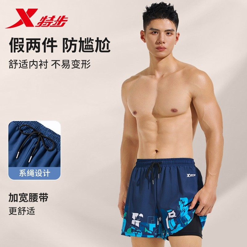 特步泳裤男款游泳裤防尴尬泳帽泳镜三件套速干运动沙滩裤男士装备
