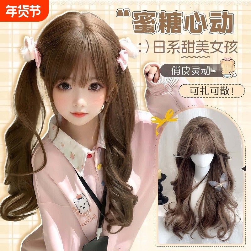 假发女款蜜茶亚麻显白发色Lolita日常蓬松空气刘海长卷发全头套式