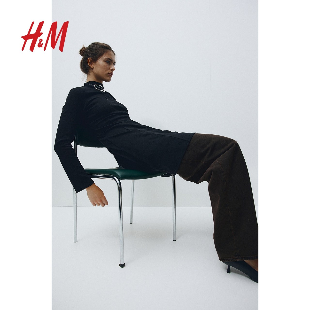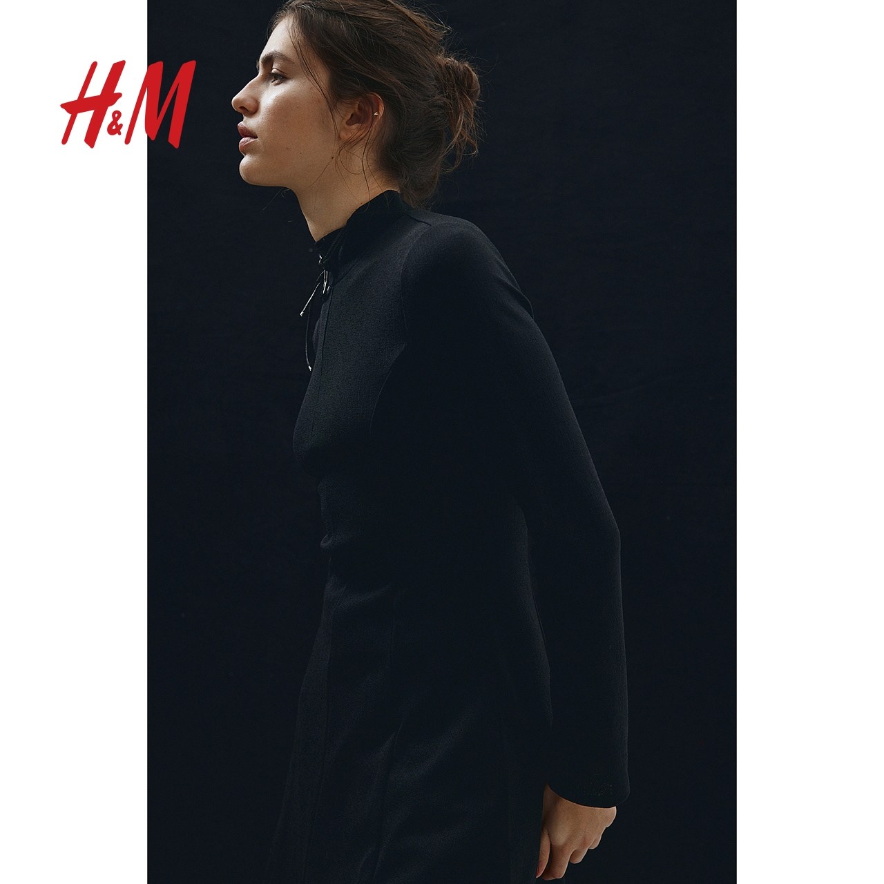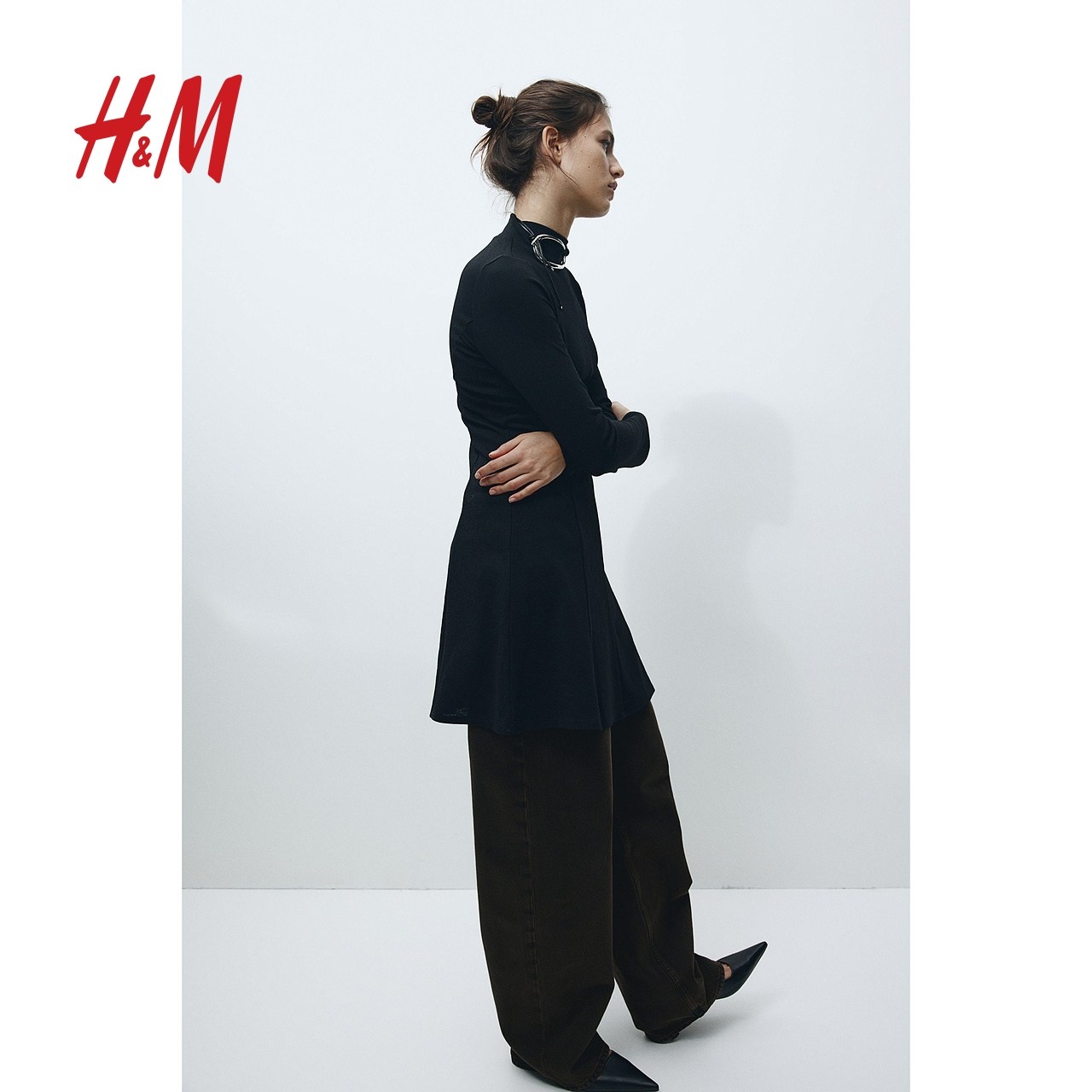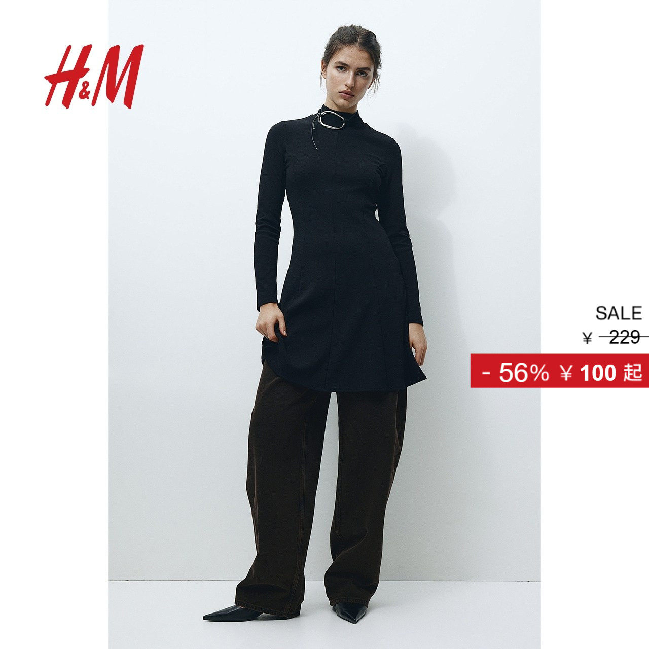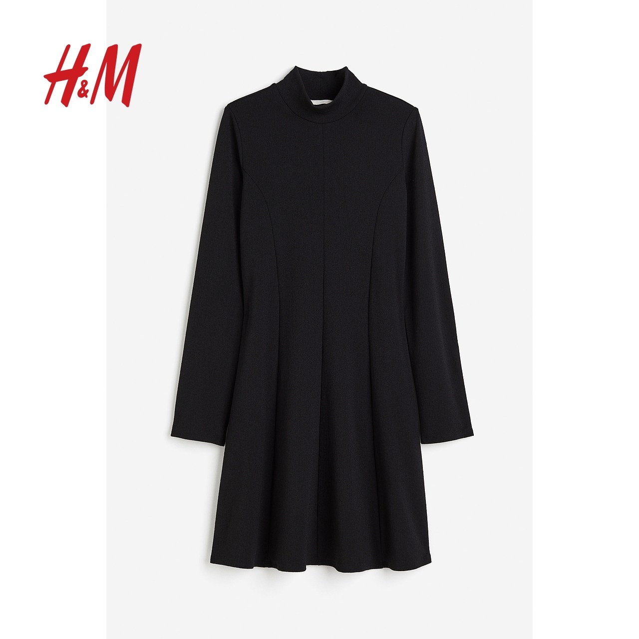 HM女装连衣裙2024冬季新款时尚气质圆高领修身喇叭短裙1217809