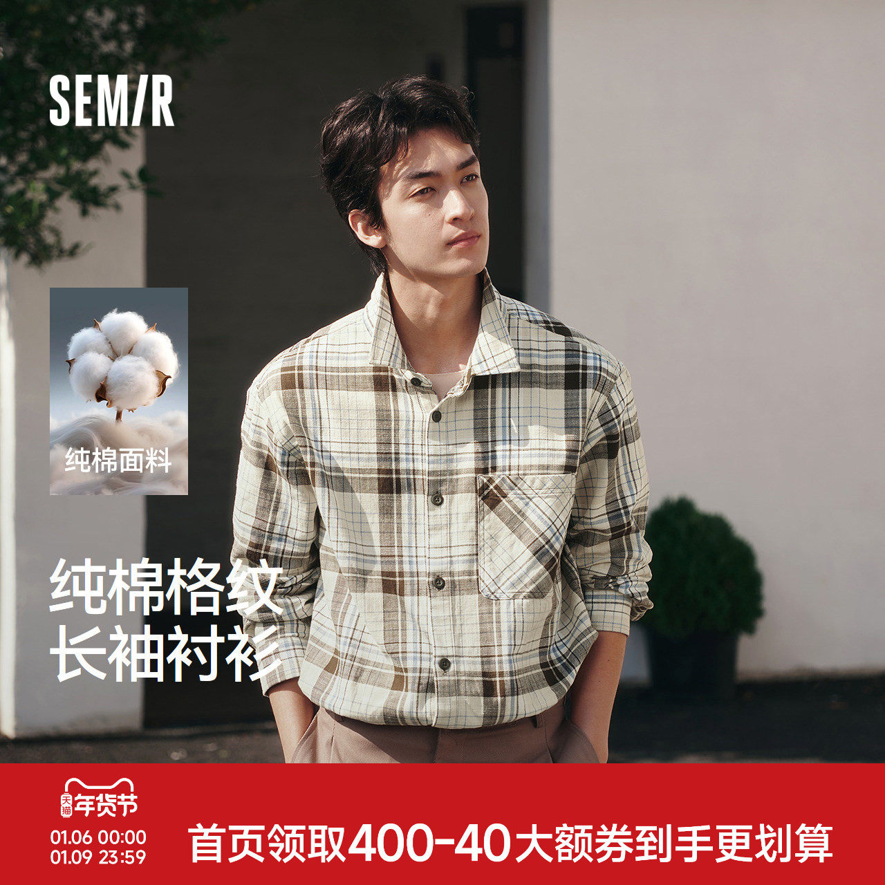森马长袖衬衫男春季纯棉格纹外套宽松翻领外穿式上衣休闲通勤百搭