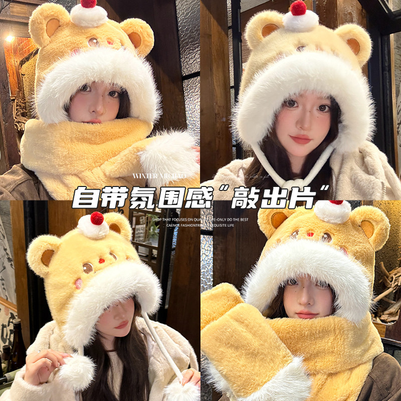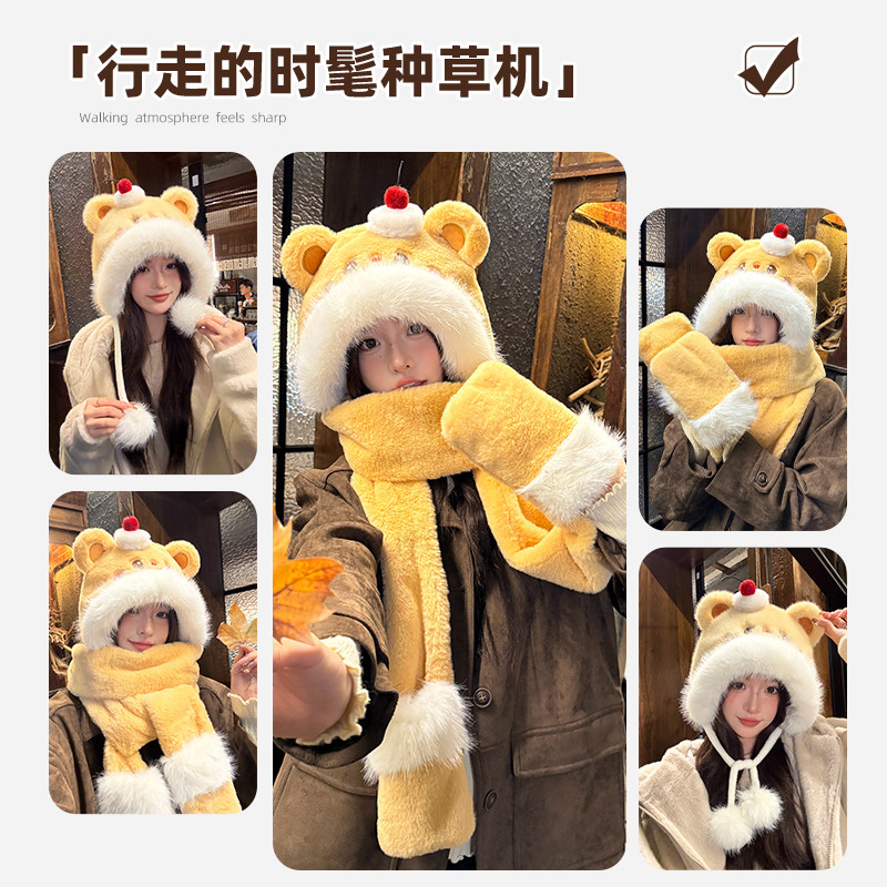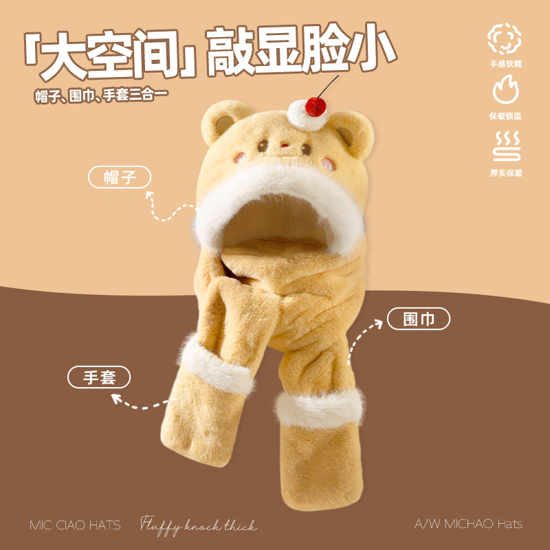 可爱小熊毛绒帽子围巾手套一体女冬季保暖防寒显脸小护耳雷锋帽潮