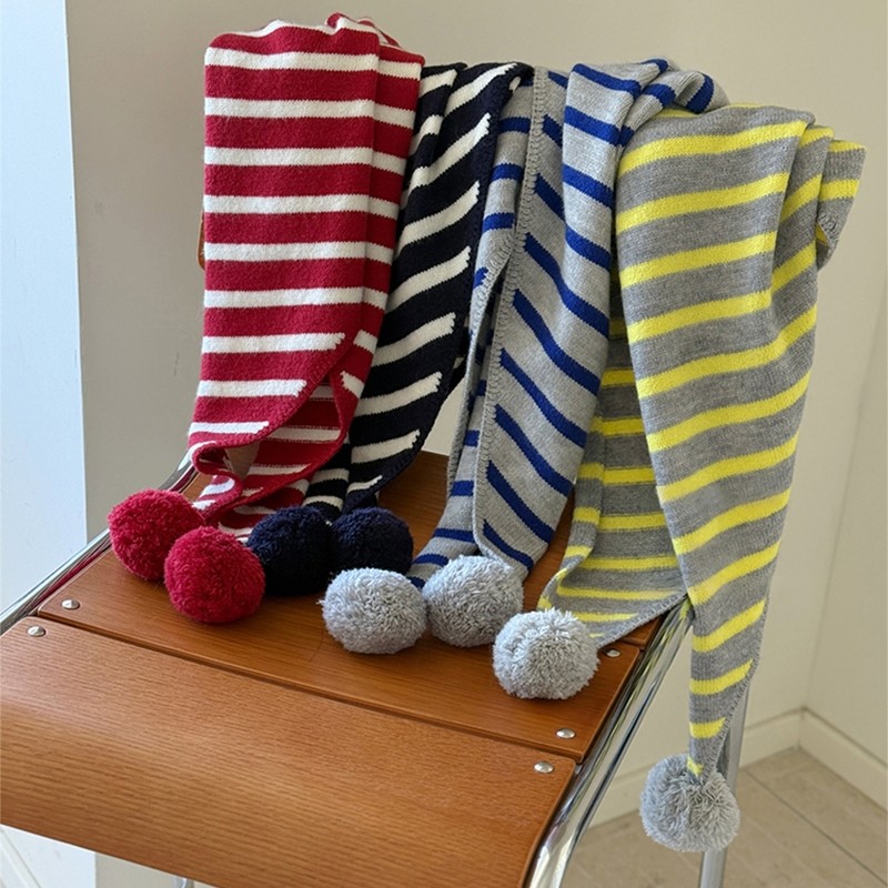 港风针织条纹毛球外披三角围巾女秋冬保暖装饰披肩围脖红白日系