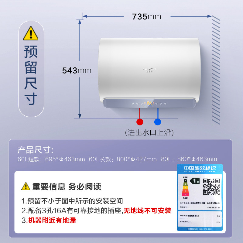 国补AO史密斯佳尼特家用电热水器60升80L金圭双棒速热洗澡遥控TT