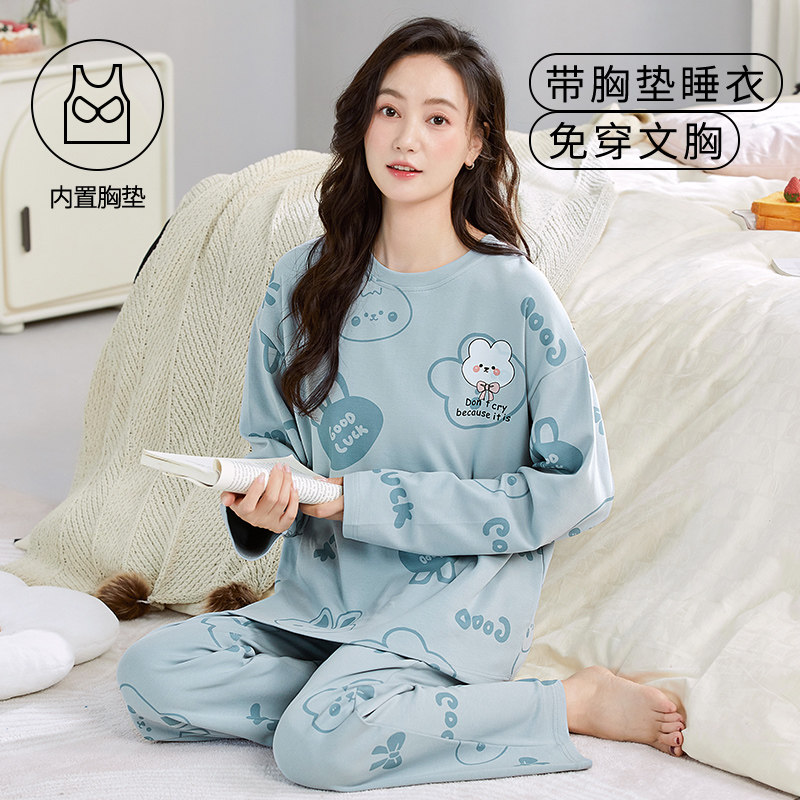 纯棉带胸垫睡衣女2025新款春秋季长袖套装可爱卡通韩版家居服秋冬