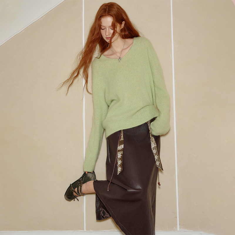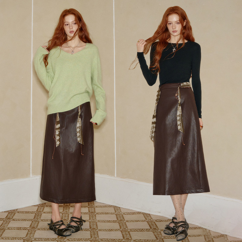 妖精的口袋高腰a字PU皮半身裙女2025年秋季新款宫廷风显瘦长裙子