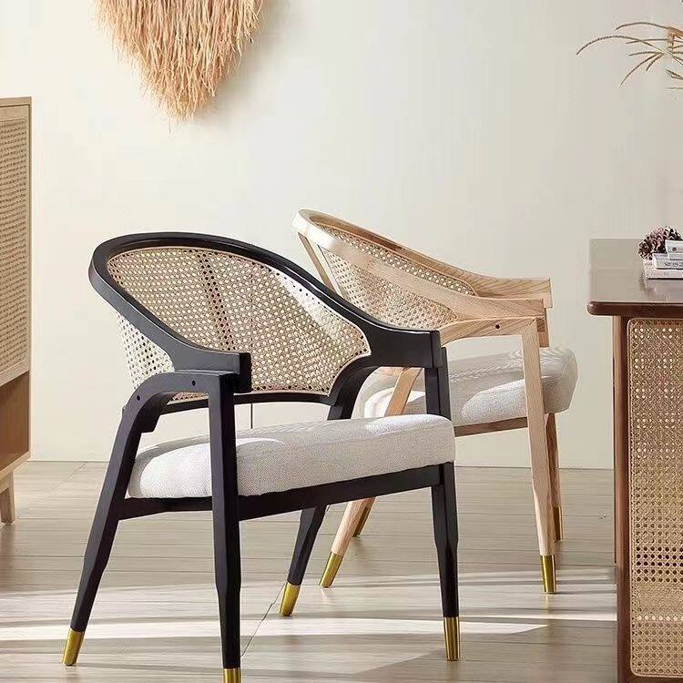 2024北欧复古简约餐椅实木藤编家用餐厅民宿软包设计师休闲椅单人