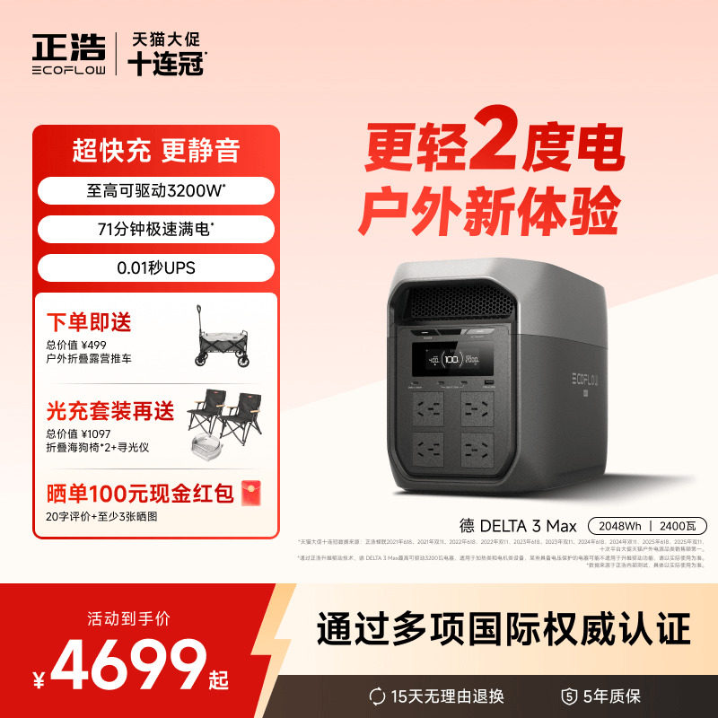 正浩EcoFlow【热销2度电】德DELTA3Max户外电源2400W大功率大容量220v移动便携储能自驾露营车载停电备用