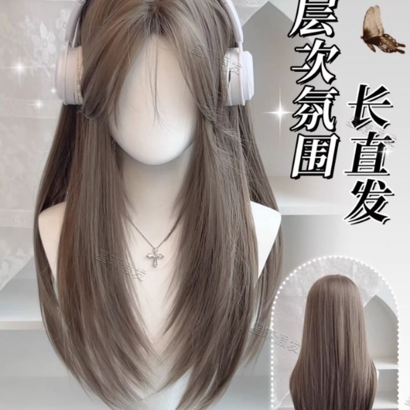 薄荷米棕星晴假发女高层次修颜外翻鬓角自然长直发全头套中分刘海