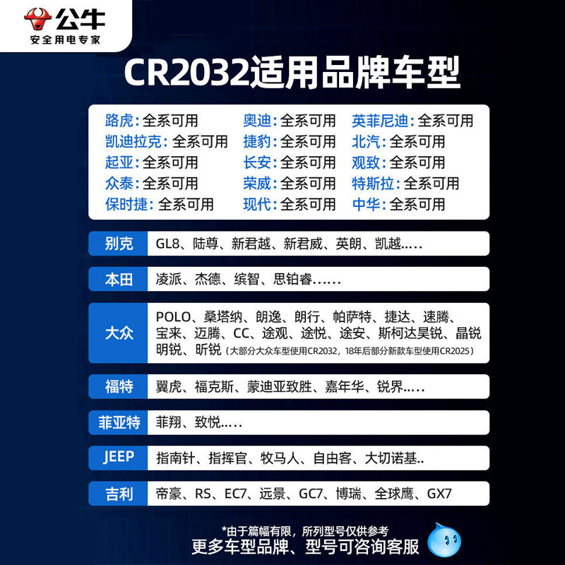 公牛汽车遥控钥匙电池通用3V小电子纽扣电池cr2032圆形cr2025适用奥迪大众奔驰宝马日产本田丰田吉利长安别克