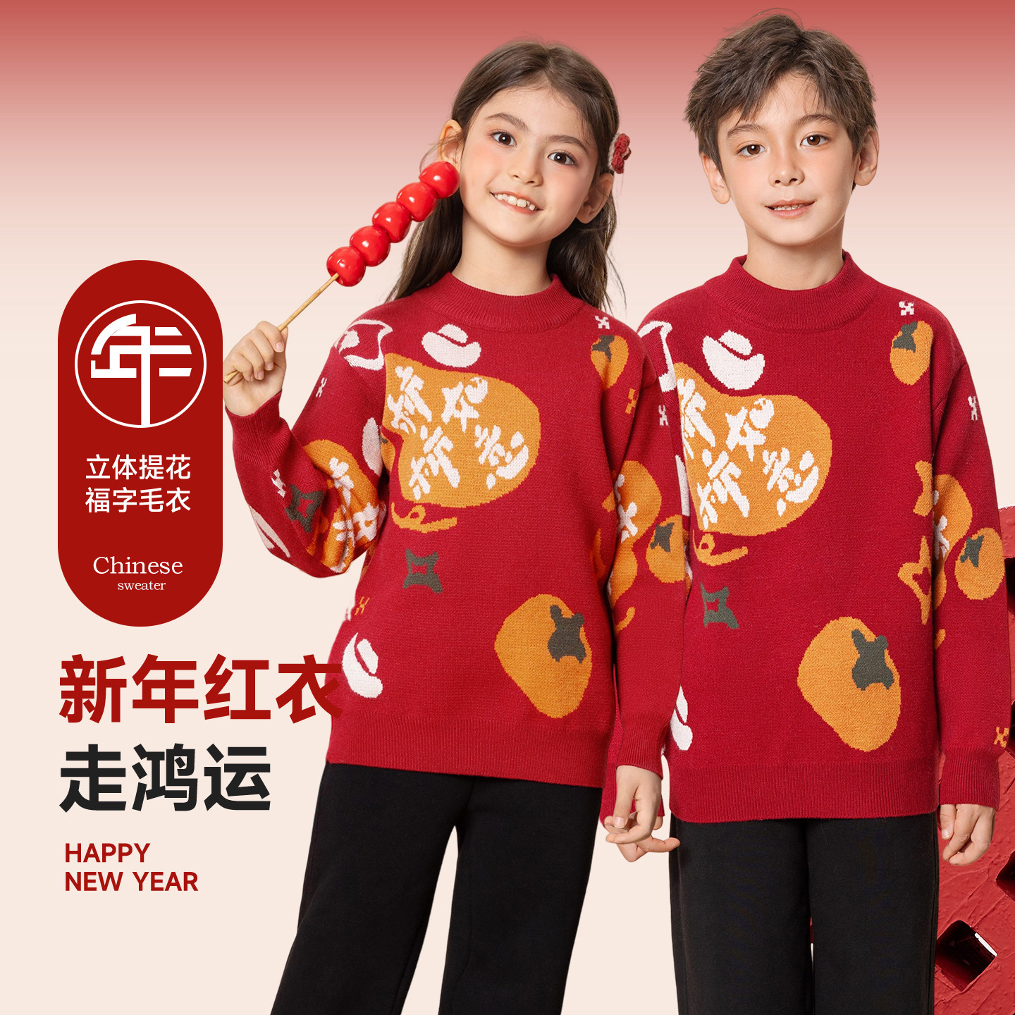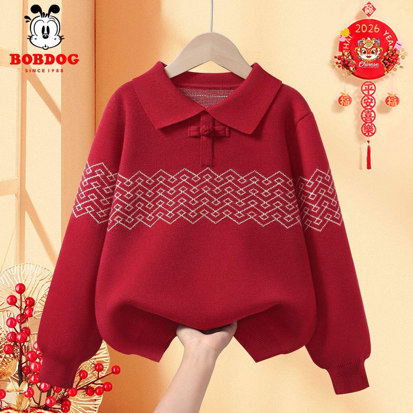 巴布豆儿童红色毛衣女童新年衣服2026马年男童拜年服上衣加绒针织
