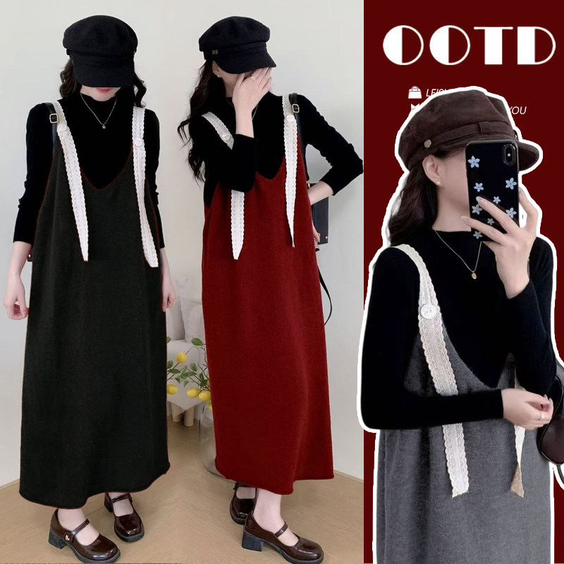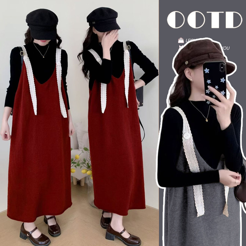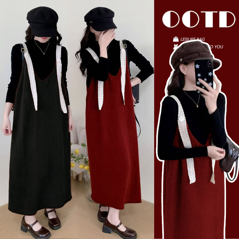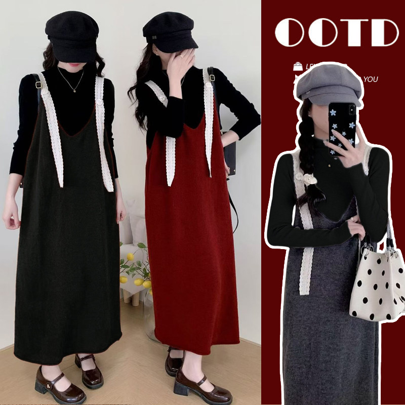 婧麒孕妇温柔慵懒风红色针织吊带连衣裙叠穿蕾丝肩带显瘦百搭长裙