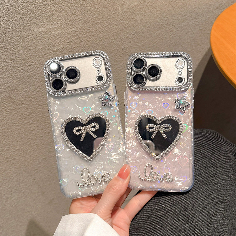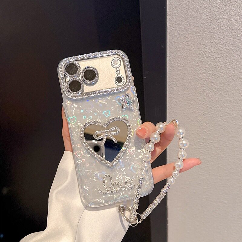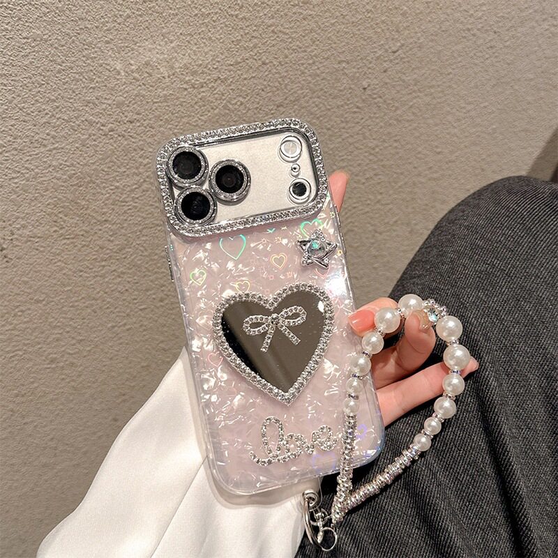 领结水钻心形镜子手机壳适用iPhone17promax炫彩贝壳纹苹果16plus珍珠手提链15pro高级感全包硬壳保护套时尚