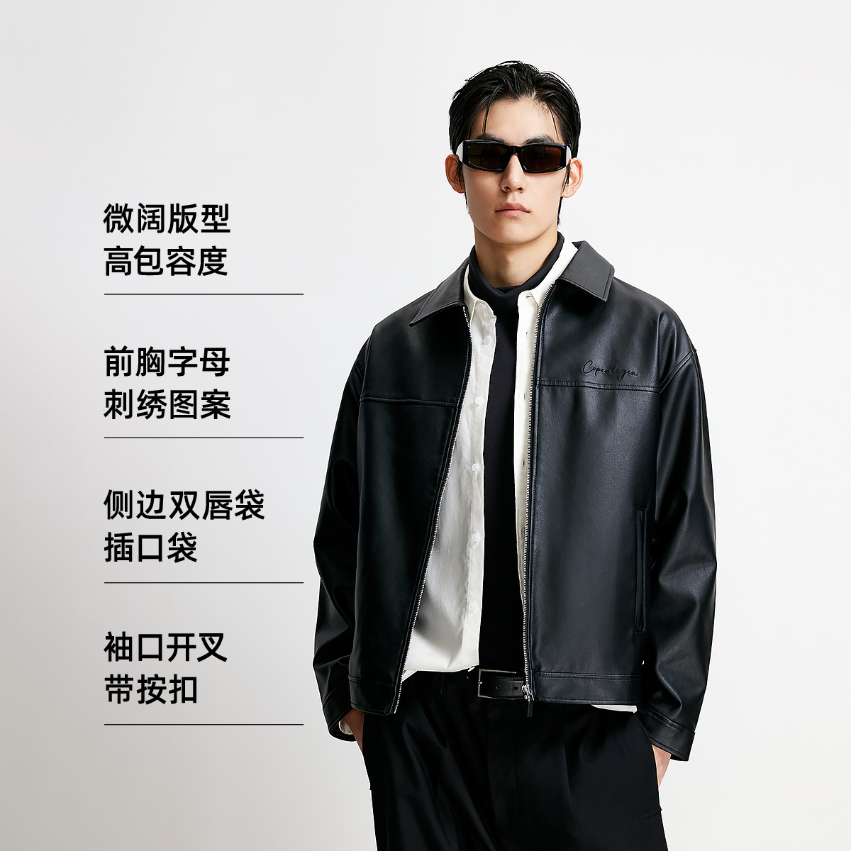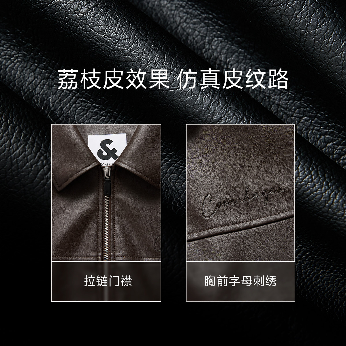 杰克琼斯男装春秋季新款潮流美式机车仿荔枝纹PU宽松翻领夹克外套