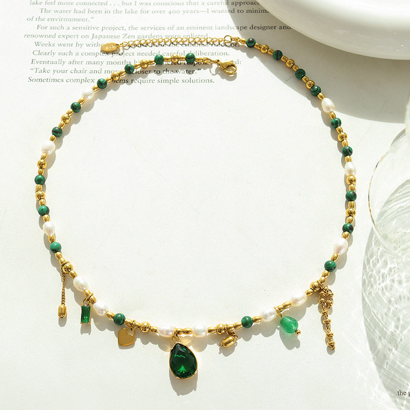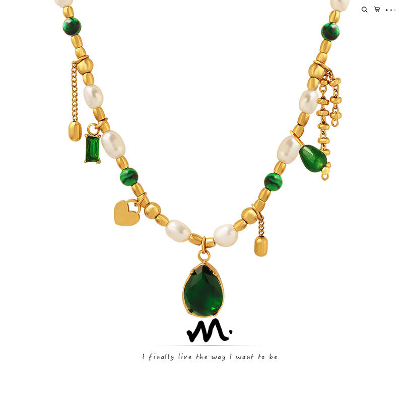欧美宫廷风不掉色设计优雅个性气质淡水珍珠锆石玉石松石吊坠项链