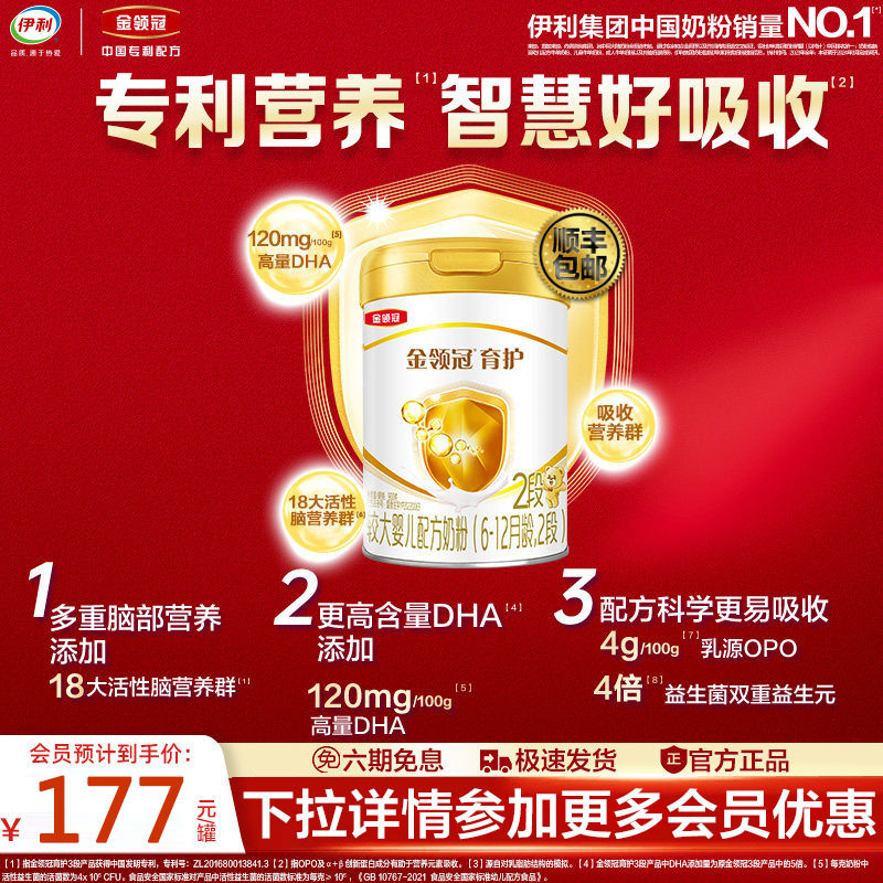 伊利金领冠育护2段900g新国标母婴旗舰店官网DHA婴幼儿配方牛奶粉