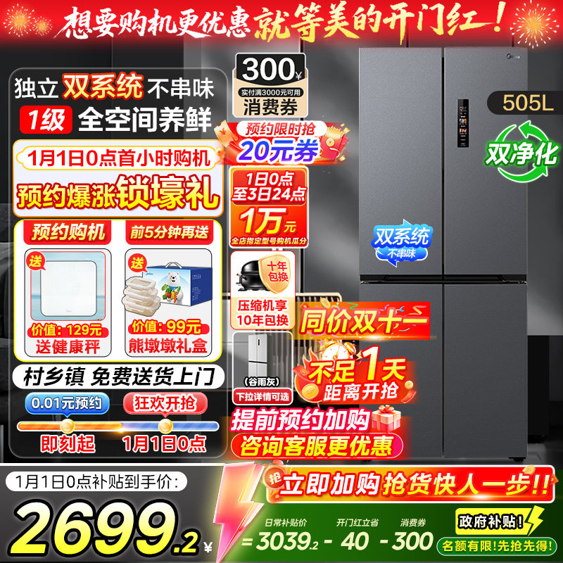 【政府换新补贴】双系统循环美的冰箱531十字四门多门对开大容量