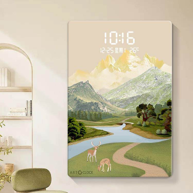 led感应时钟玄关装饰画日照金山客厅落地画带灯过道走廊壁画挂钟
