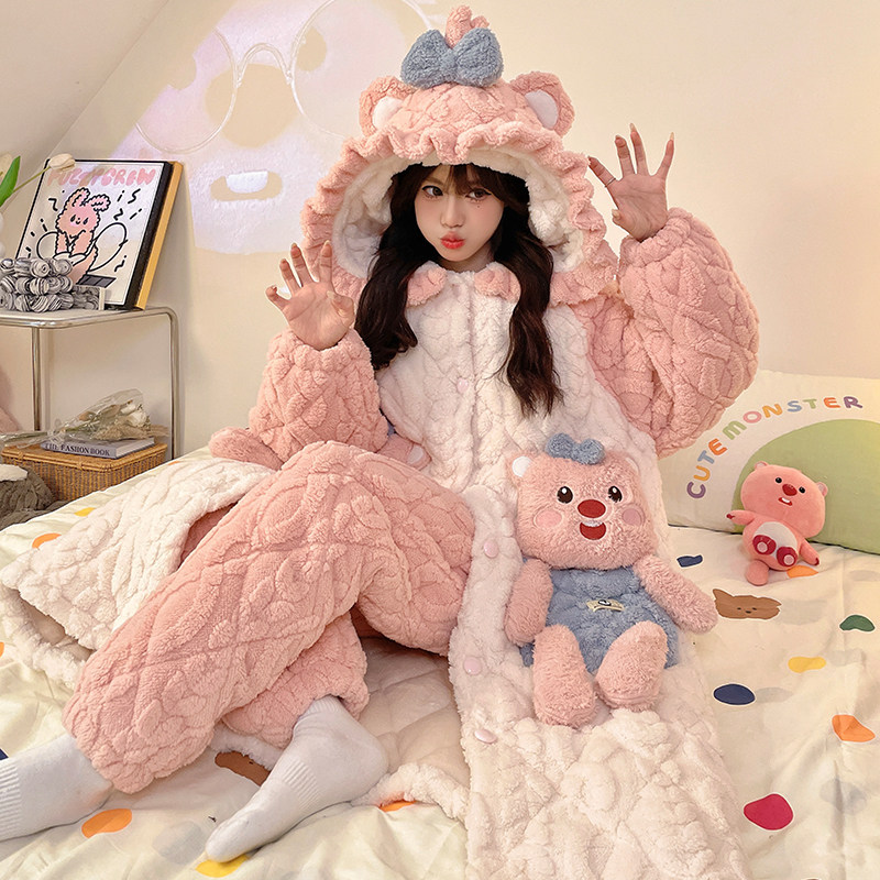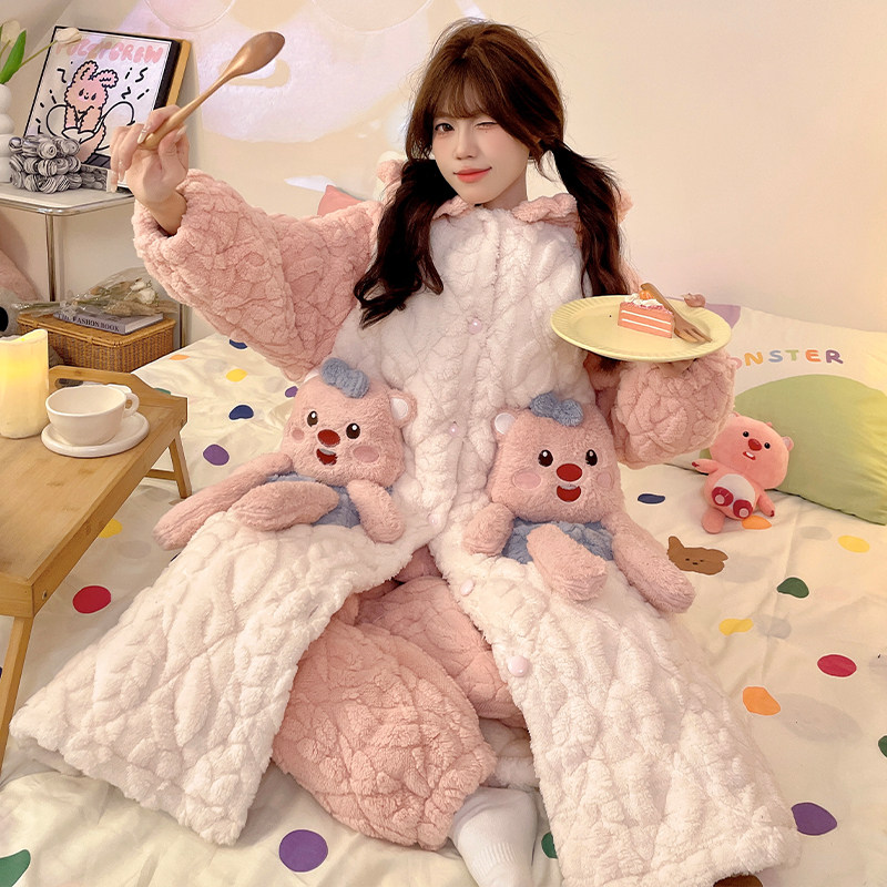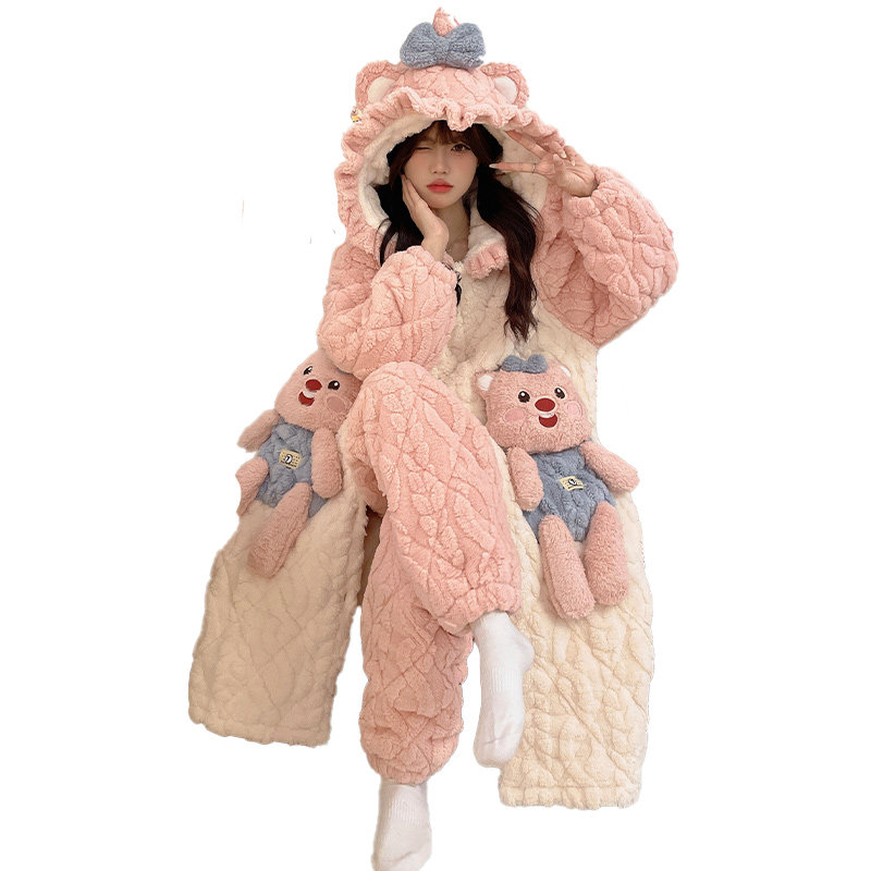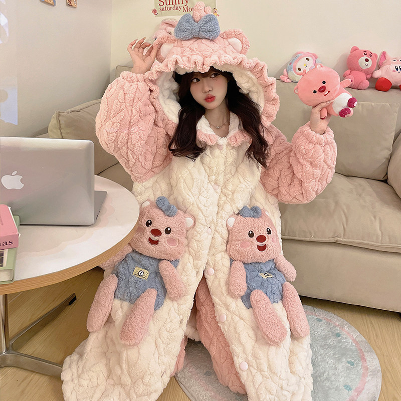 2025秋冬款长款连帽睡袍女士珊瑚绒三层夹棉加厚睡衣家居服可外穿