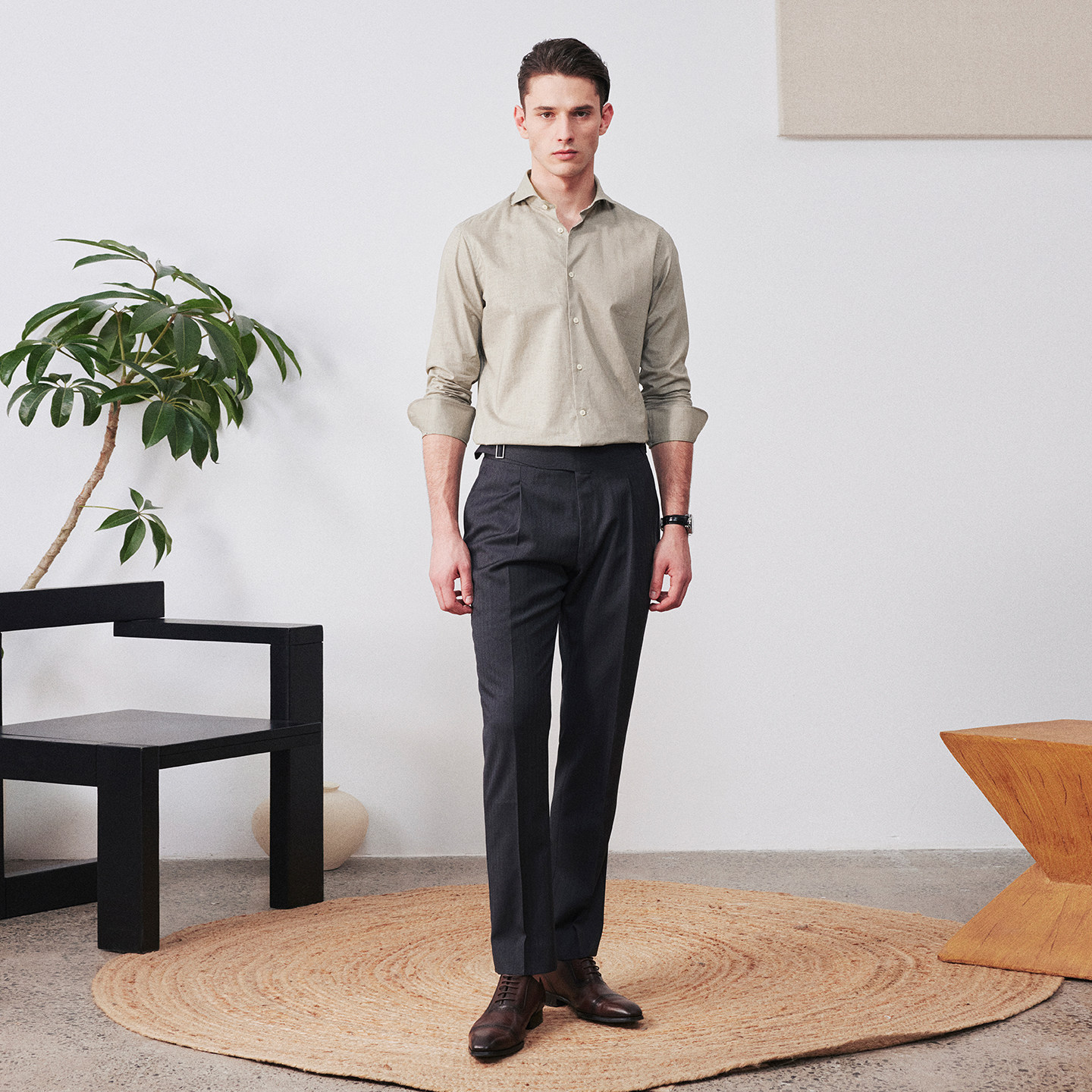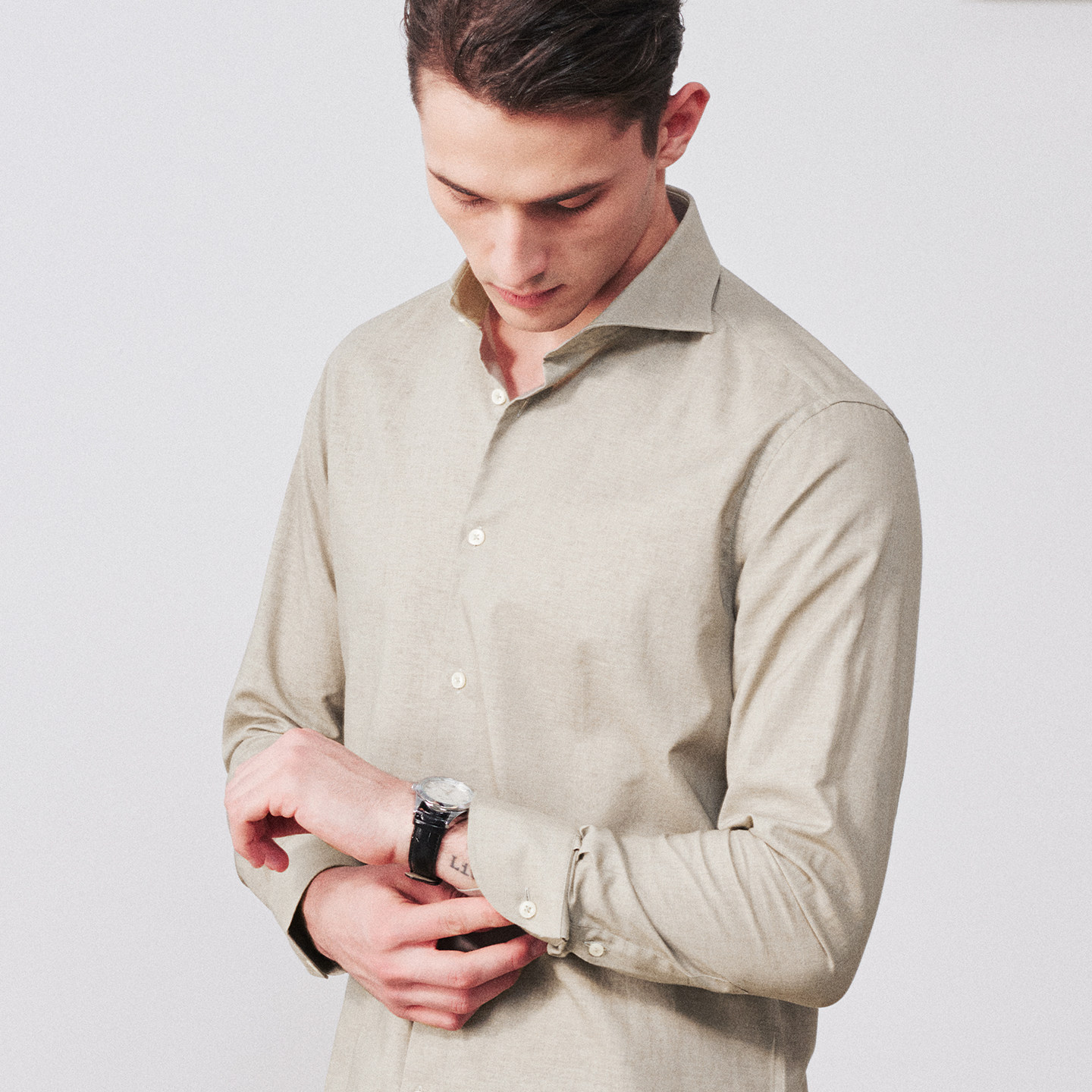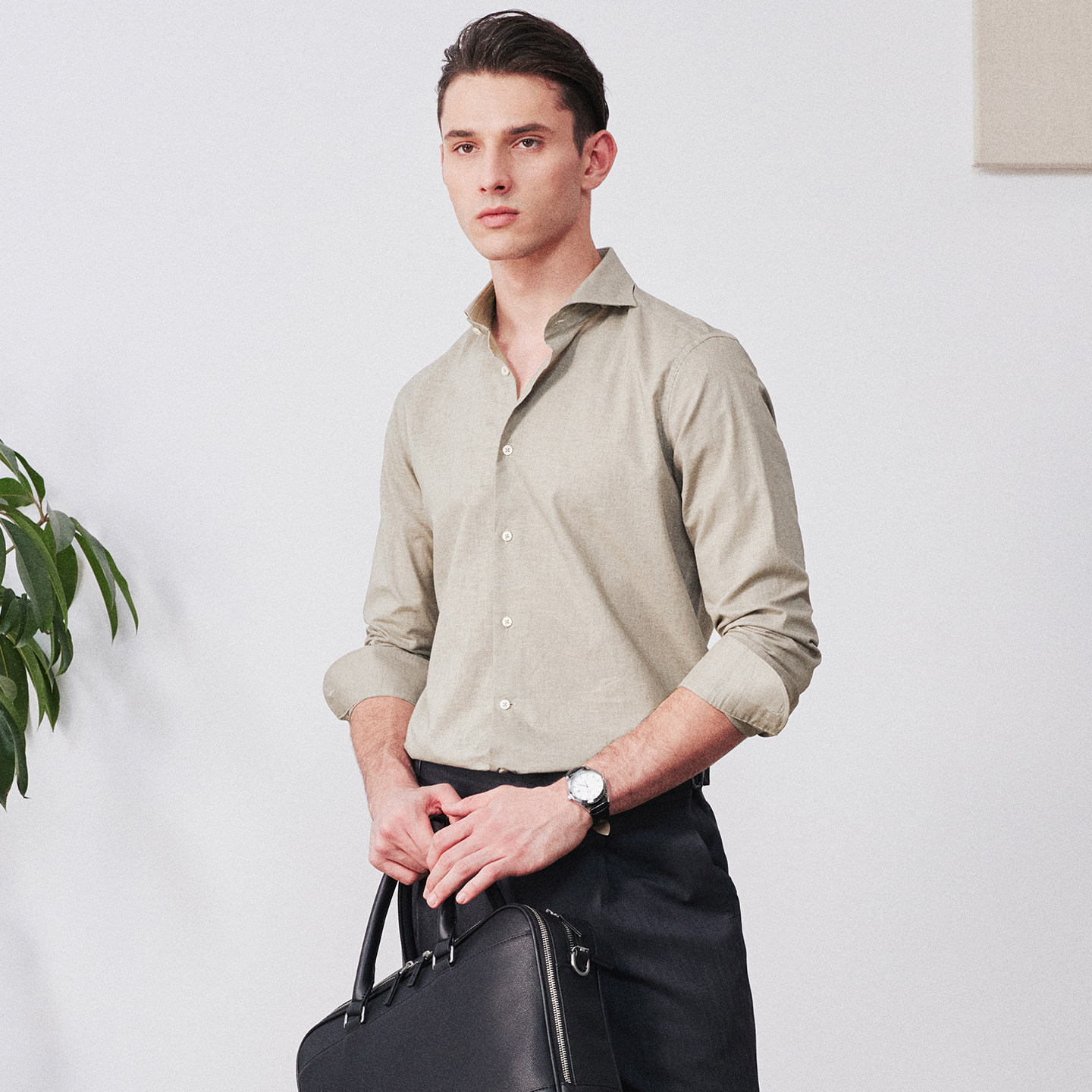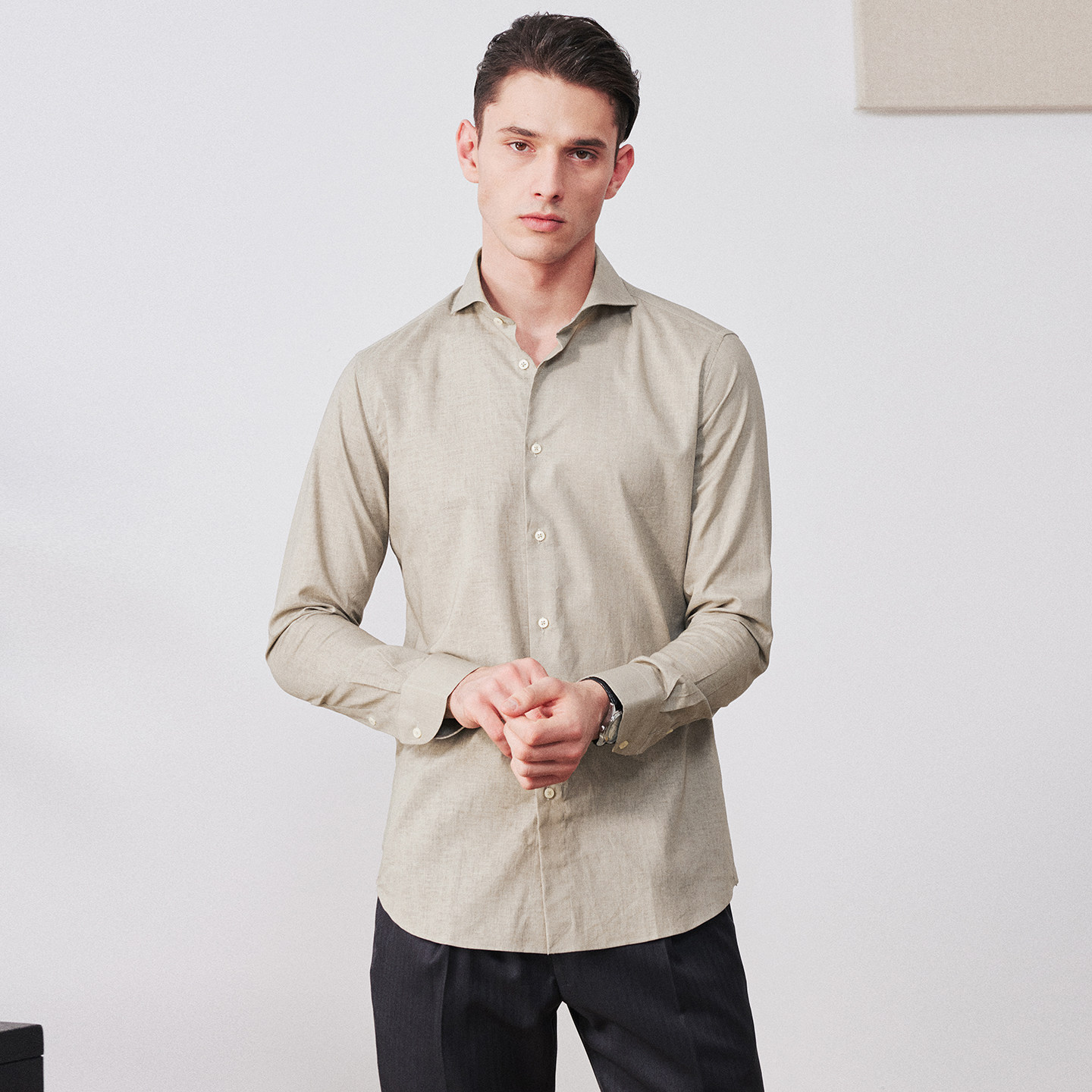 柏品棉亚麻商务休闲衬衫男透气修身暗扣弧开领长袖职业正装衬衣