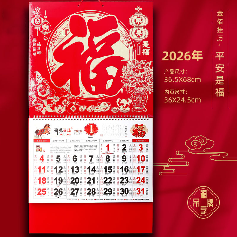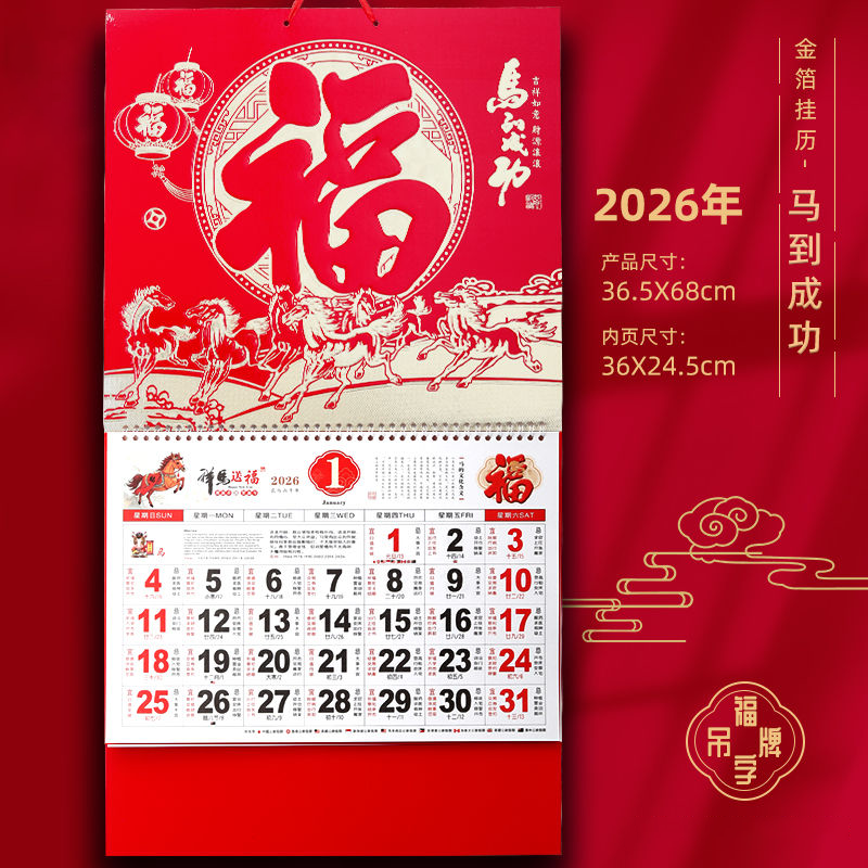 2026年挂历新款大号马年加厚福字年历家用挂墙创意日历中国风台历