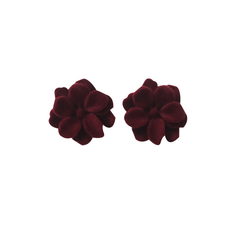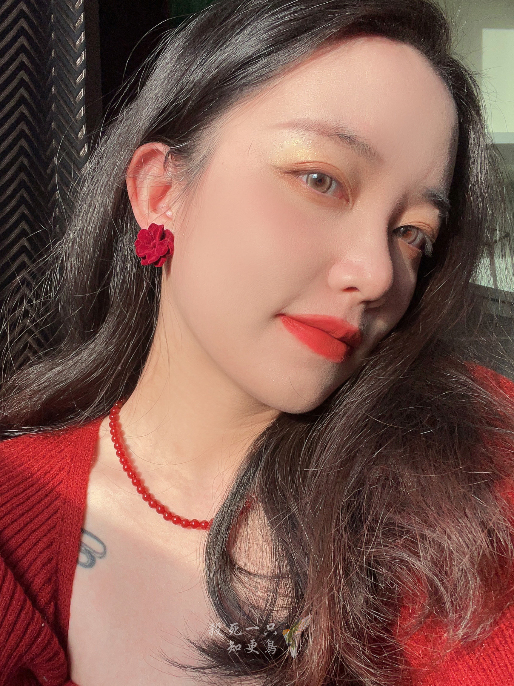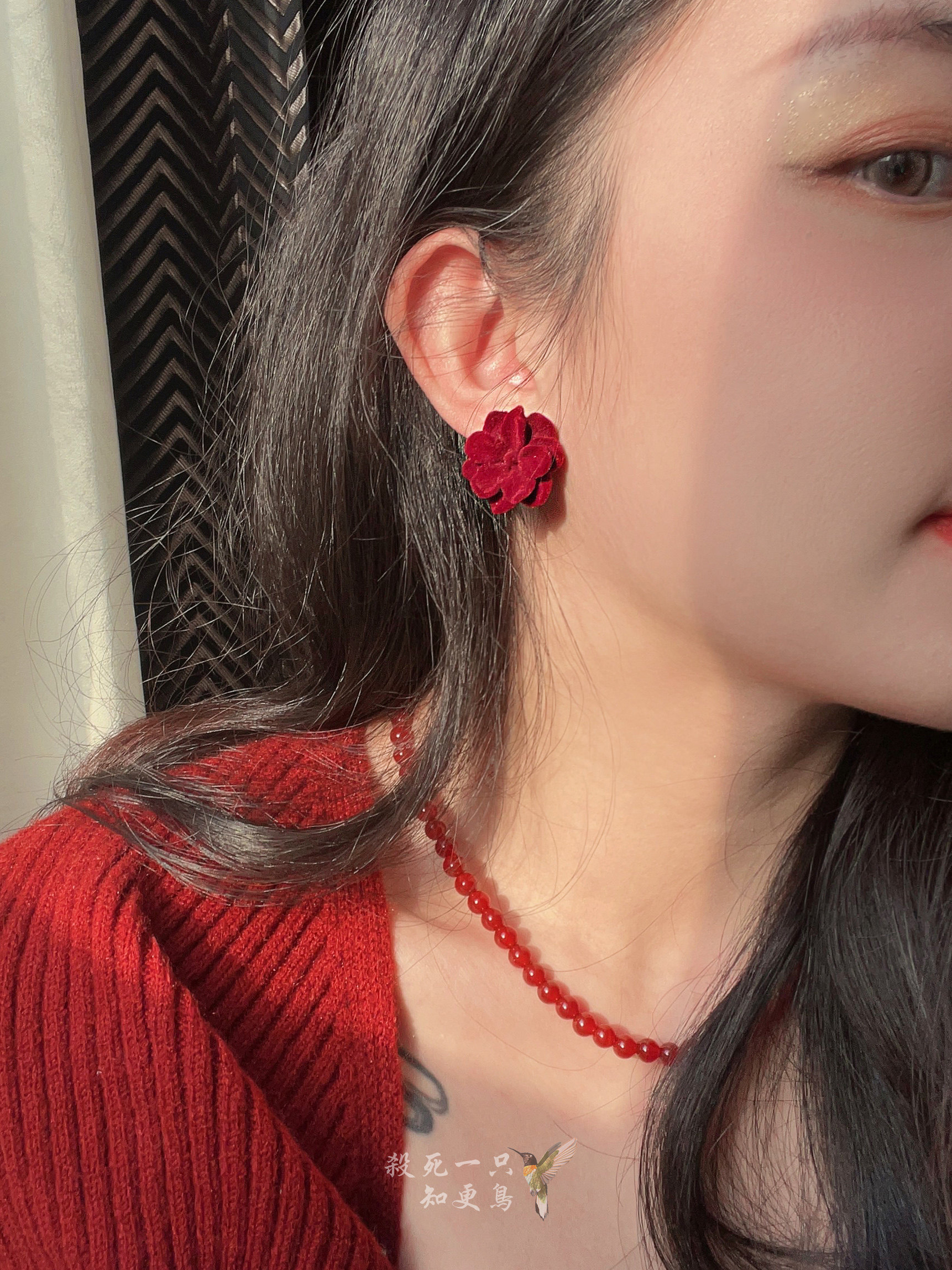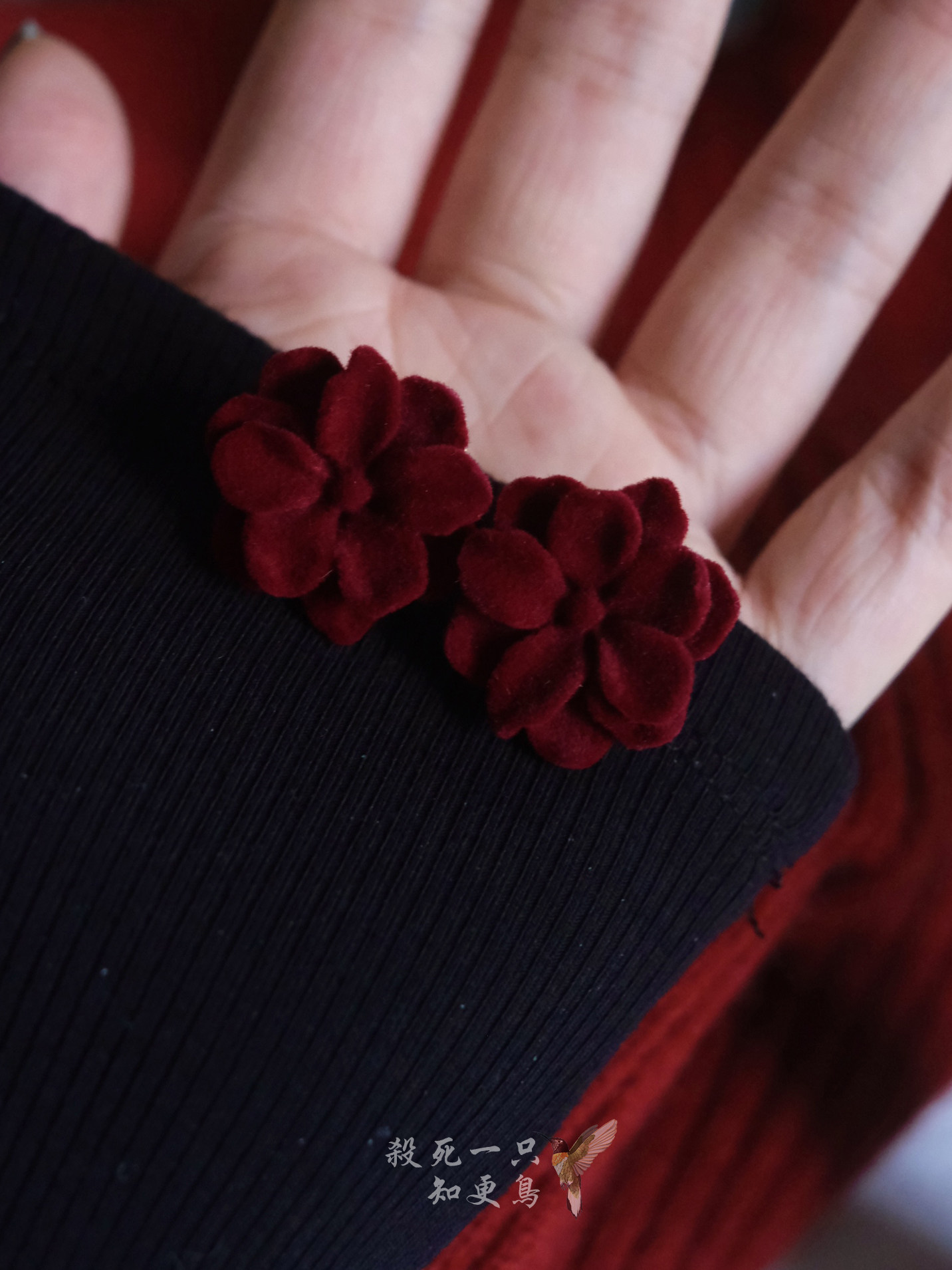 《弗洛伊德玫瑰》秋冬复古港风新年圣诞酒红花朵丝绒质感耳钉耳环