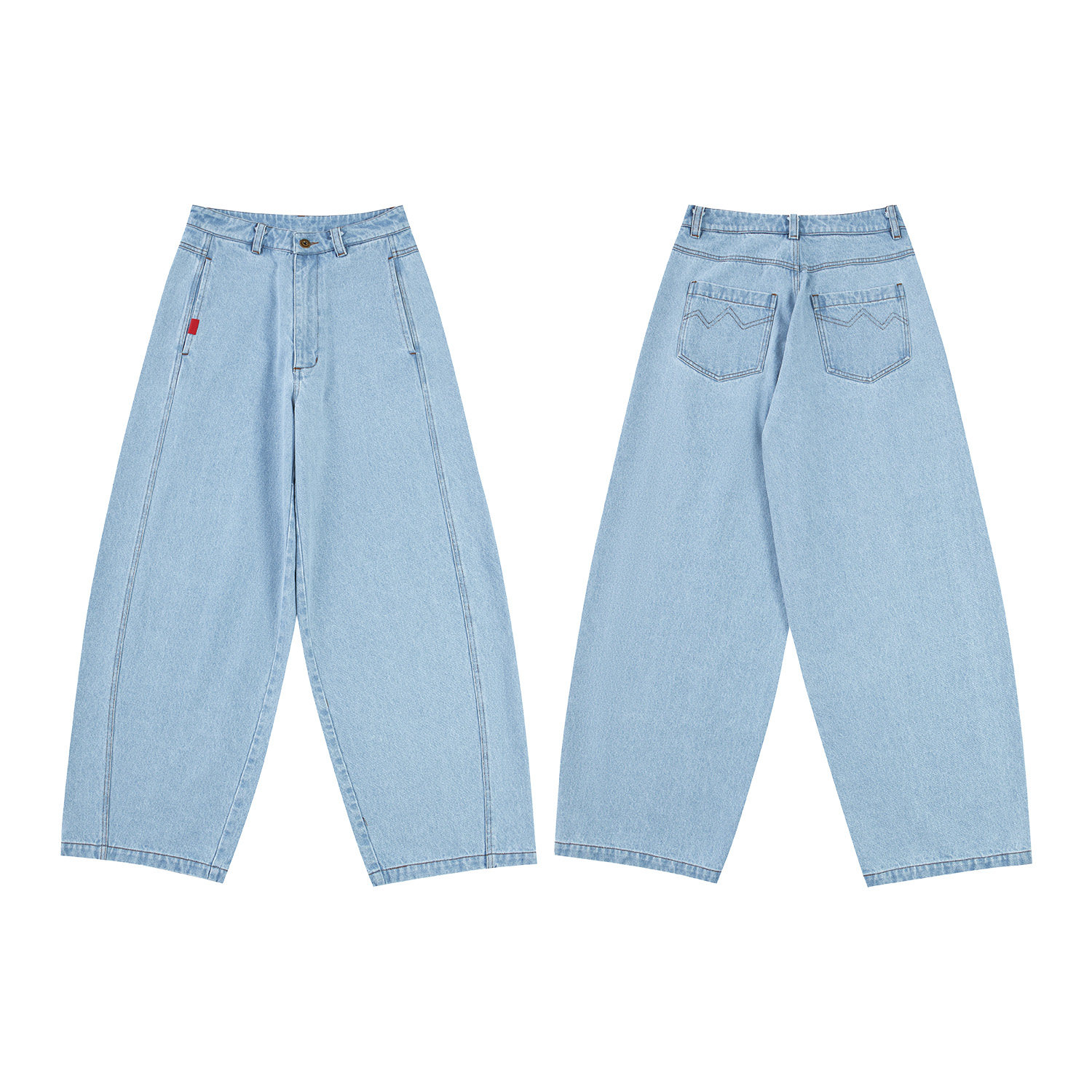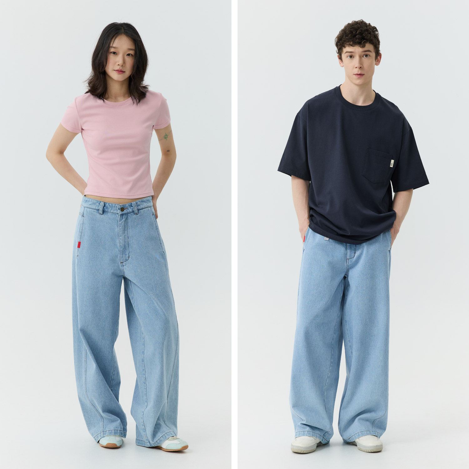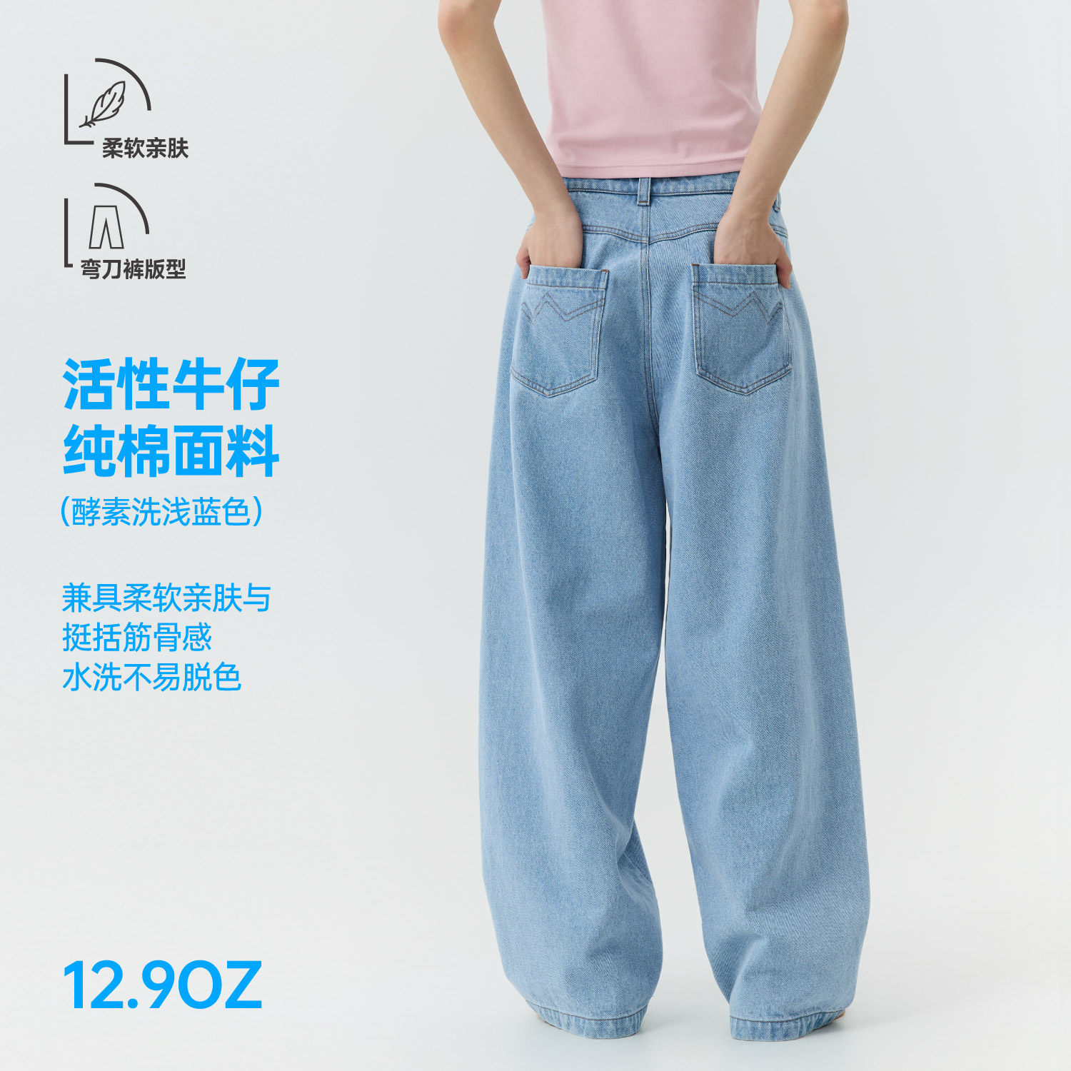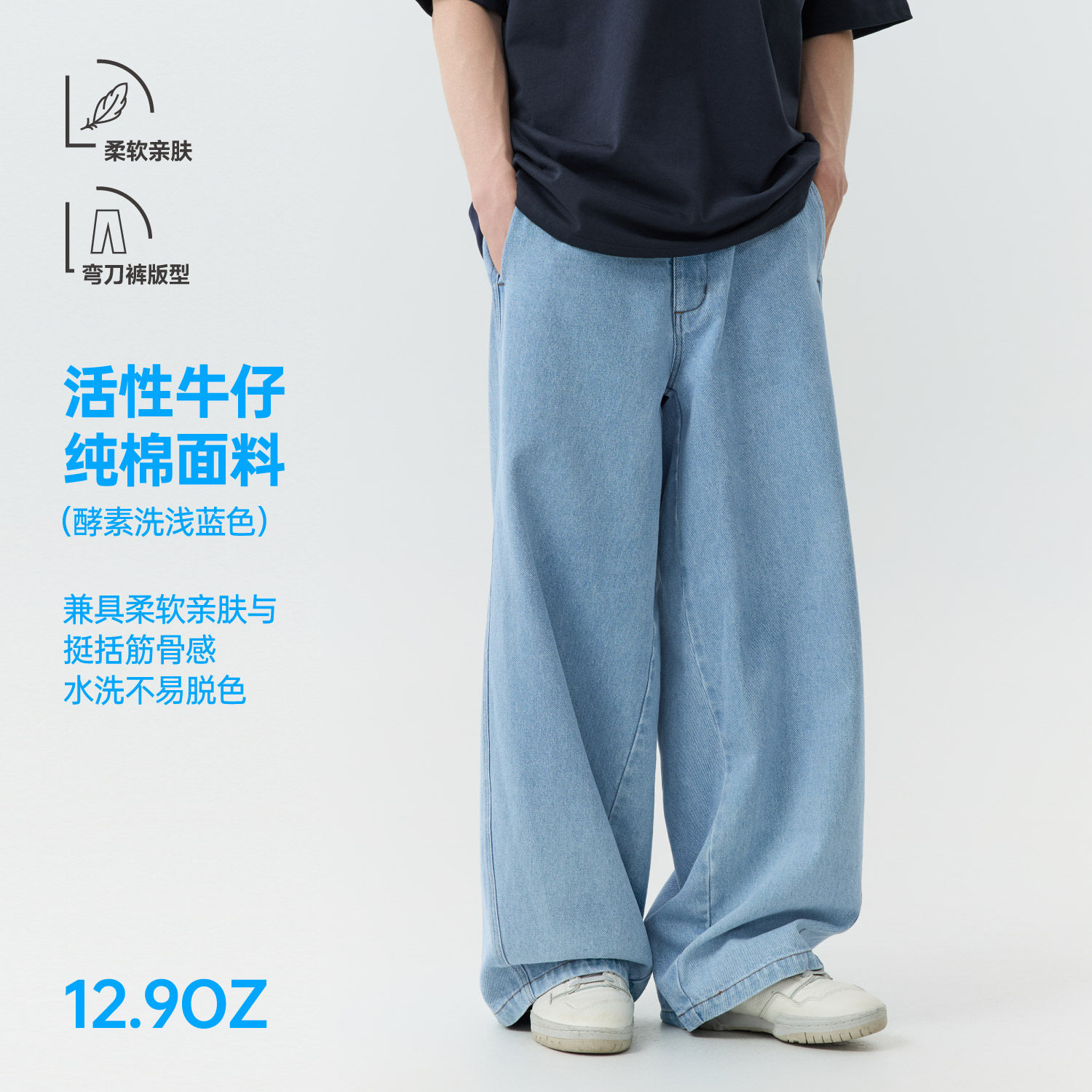 warmtrees夏季12.9OZ挺括弯刀牛仔长裤男女款(酵素洗浅蓝色)