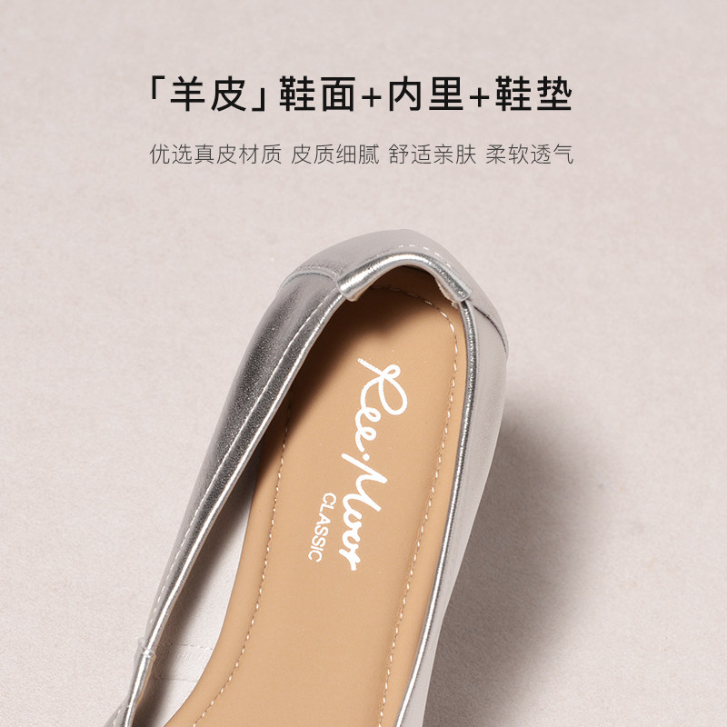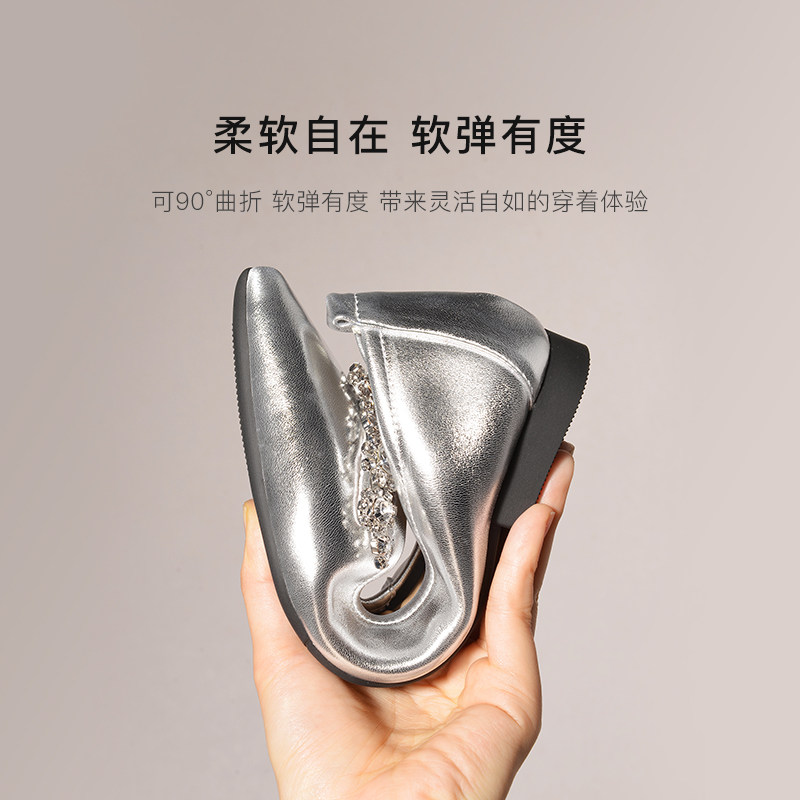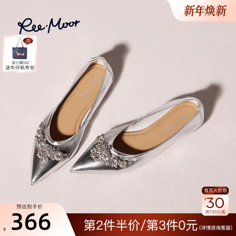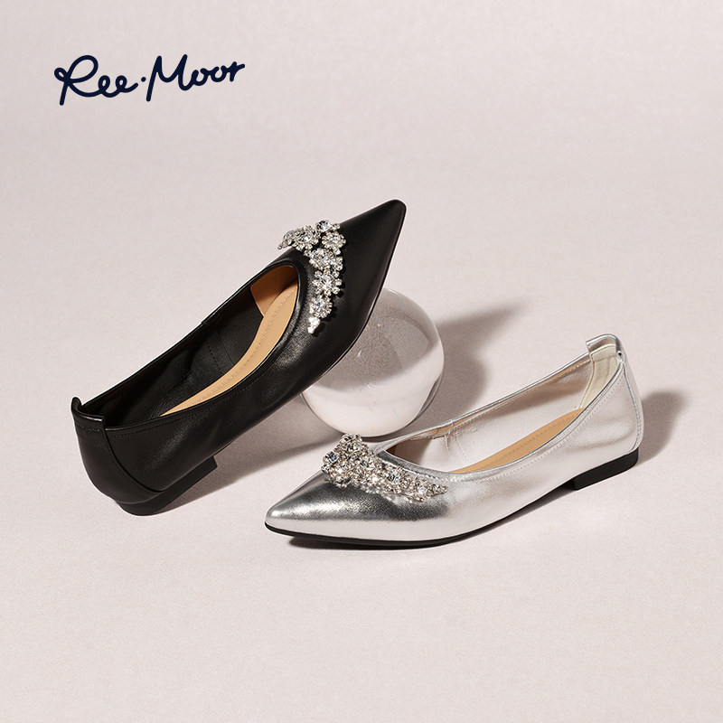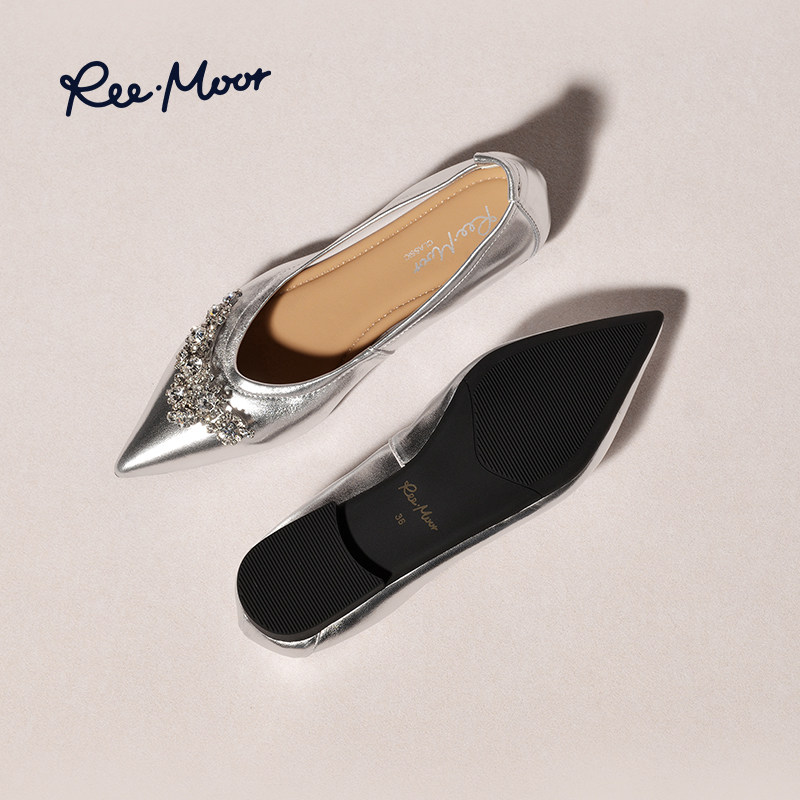 REEMOOR睿慕2025秋季新款尖头单鞋女银色浅口平底气质软底水钻鞋