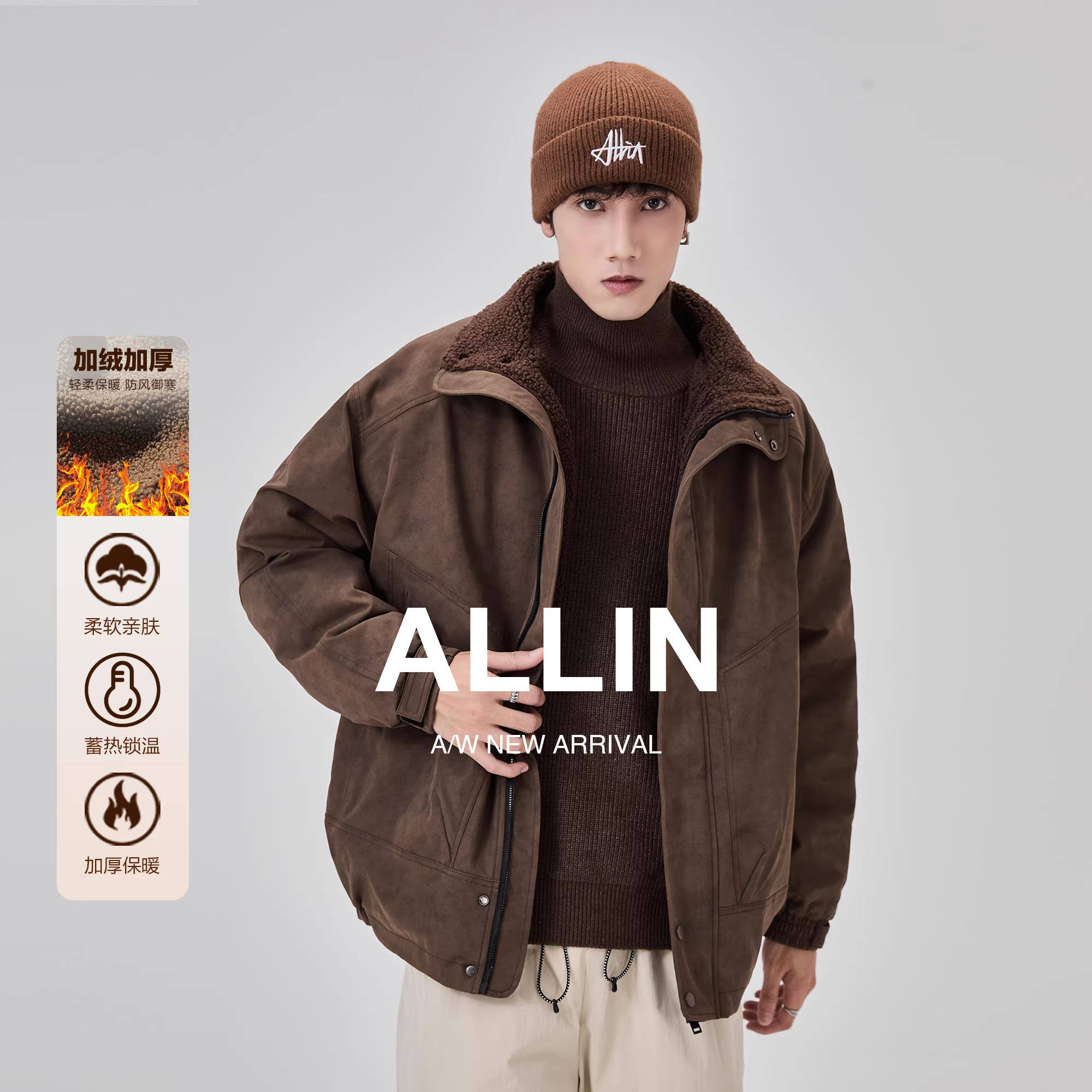 ALLIN 美式复古棕色外套男秋冬季美拉德加绒加厚宽松机车情侣夹克