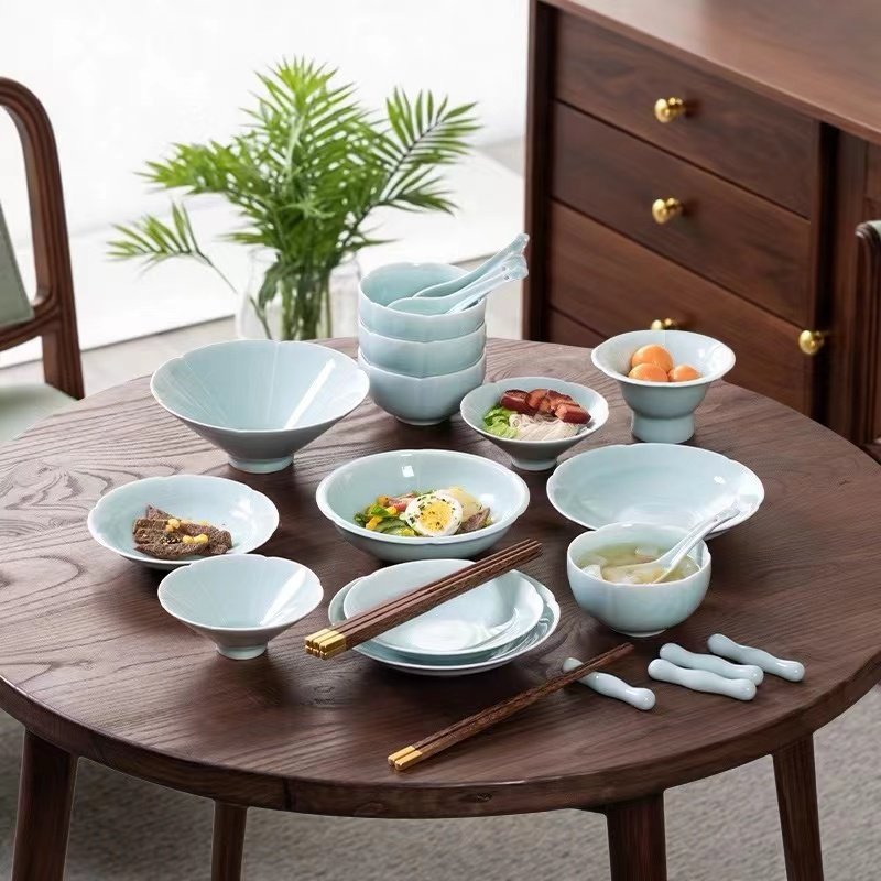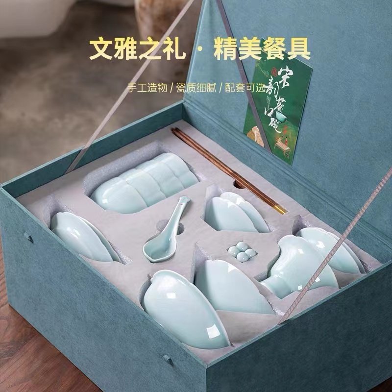 高档青瓷餐具套装中式宋风陶瓷碗碟盘子套组家用饭碗礼盒瓷器送礼