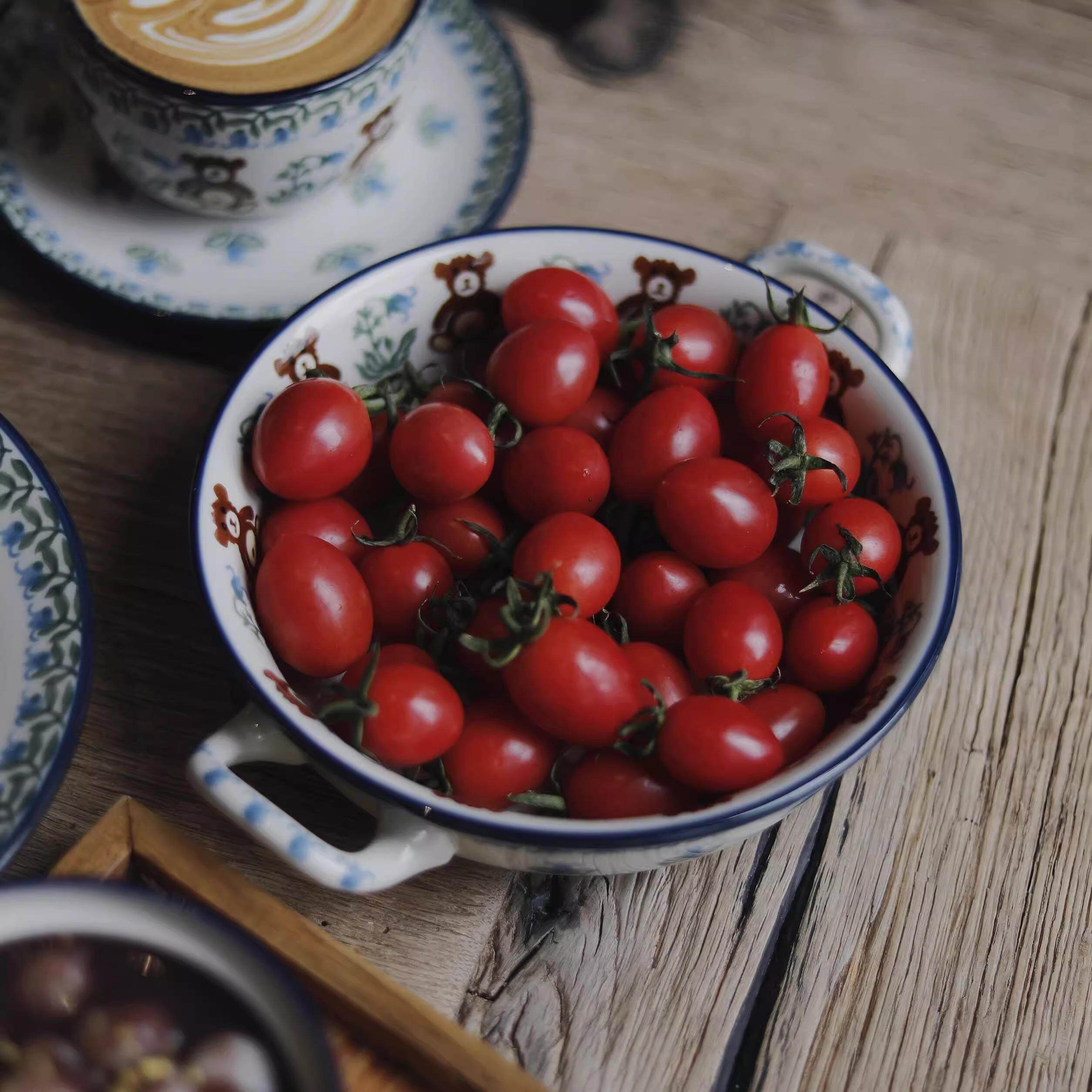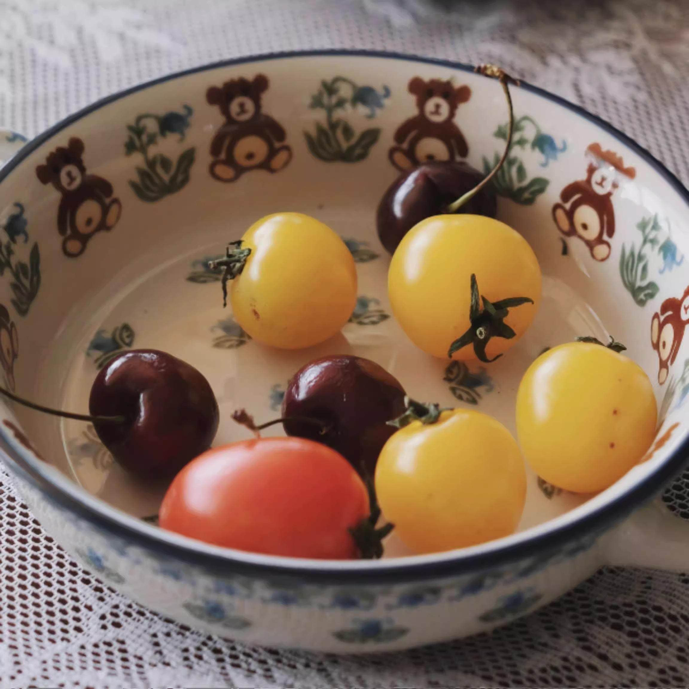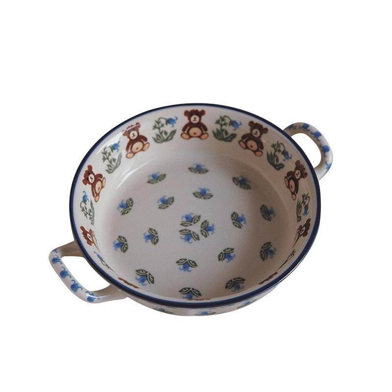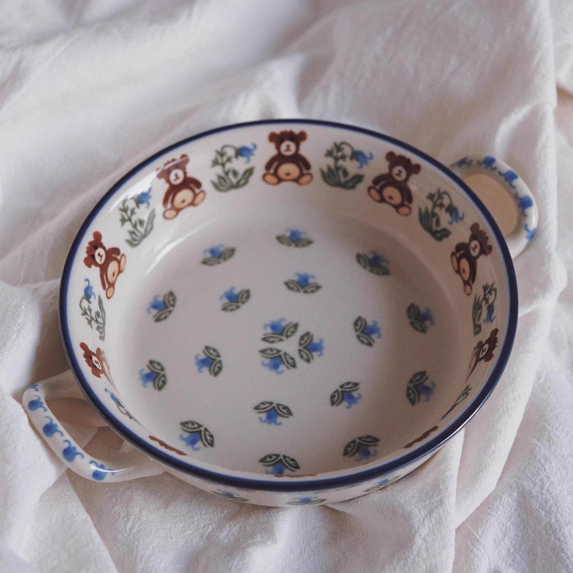 现货波兰手绘陶瓷小熊深盘波兰陶瓷风铃花小熊双耳碗甜品盘小食碟