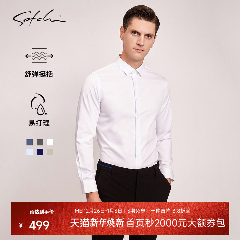 [免烫]SATCHI沙驰男装男士长袖衬衫秋季新款商务休闲结婚白色衬衣